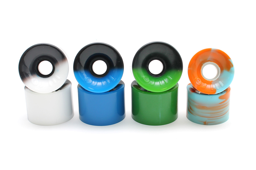 Hot Juiceの5050シリーズ。写真左から、WHT/BLK(60mm 78a)、BLUE/BLK(60mm 78a)、Willis KimbelIカラー(60mm 78a)各色すべて¥7,560。Hot Juice Mini シリーズのOrange/Blue Swirl(55mm 78a)¥6,480