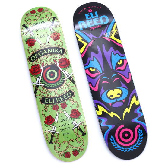写真左から、Eli Reed Love All(7.81×31.5 / 8.06×32)、Eli Reed Animal Instinct(8.1×32)。ともに¥11,880
