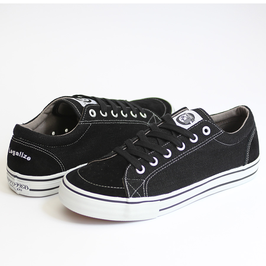 通気性に優れ裂けに強いヘンプ素材をアッパーに用いたチャッカーズコラボ。タンにはバンドのロゴをレイアウトしたほか、ヒールには刺しゅうを採用。Legalize ¥13,200