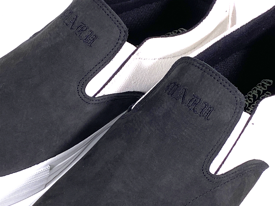 アッパーの履き口部分にはMARUの刺しゅうが入る。