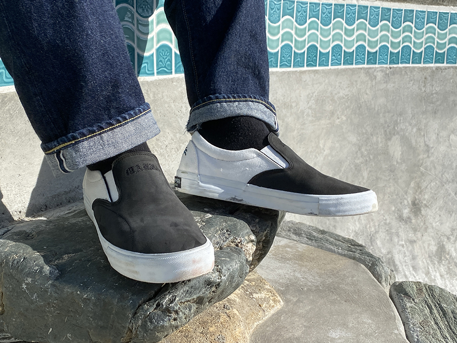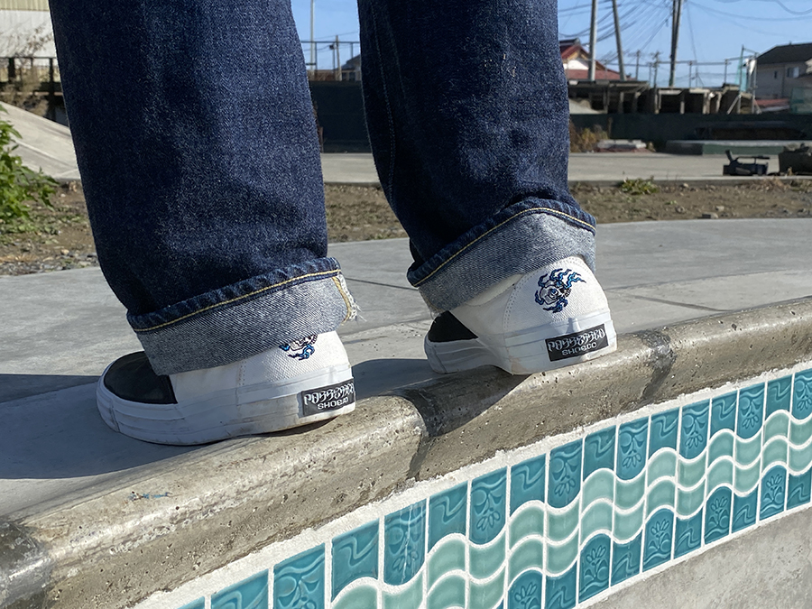 自身に彫られているタトゥーの刺しゅうをかかとに採用。デザインは彫師KOYASHUによるもの。