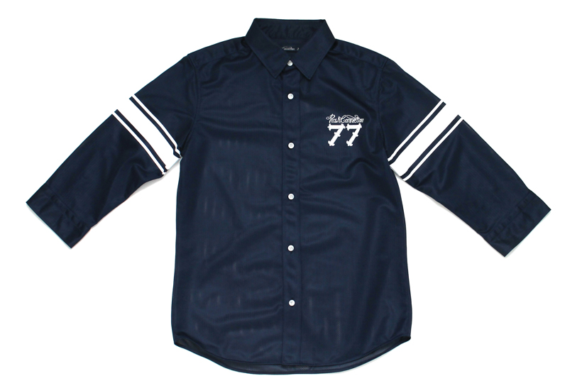 胸から肩にかけて色違いの素材を用いたラグビーTシャツ。フロントには岡田 晋の誕生年にちなんだ77のナンバリングがプリント。
