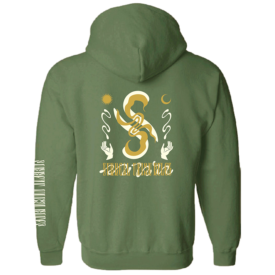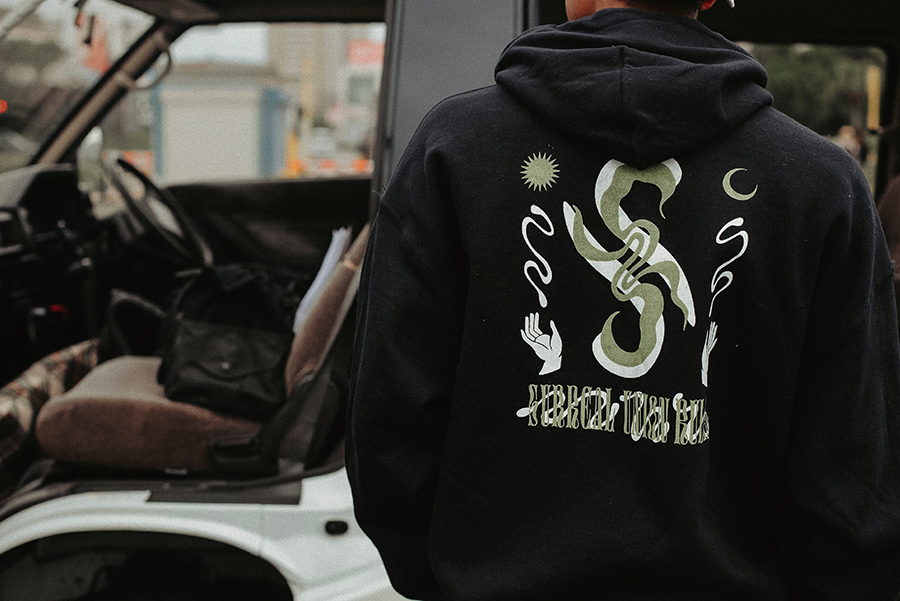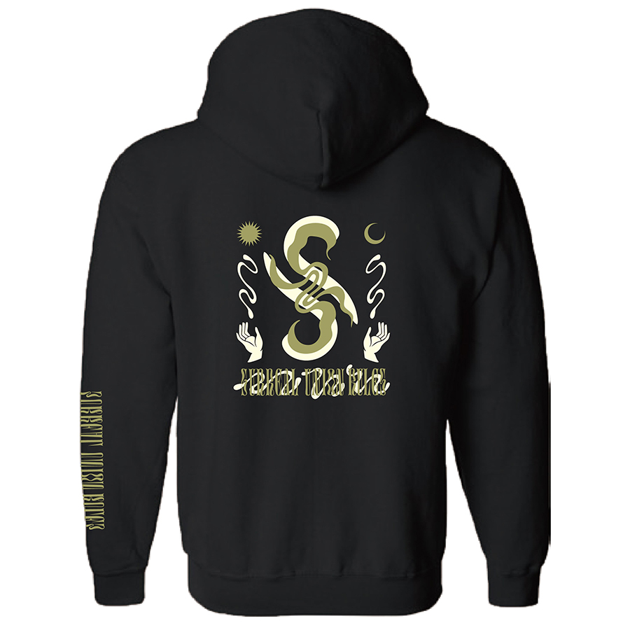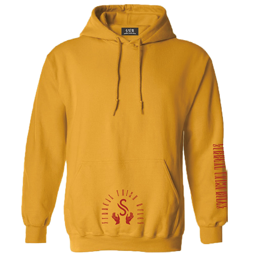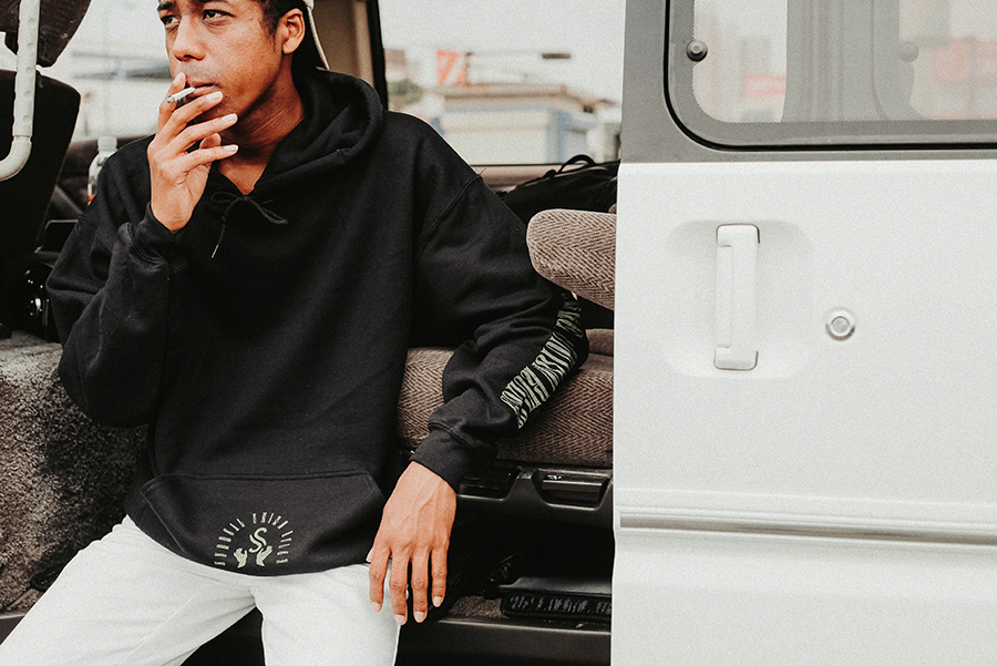 8.0ozヘビーブレンドフーディ。肩・腕穴・首・ウエスト・袖口はダブルスティッチ仕様、 ポケット・バック・スリーブにスクリーンプリントが入る。S-Hands Hoodie すべて¥8,250