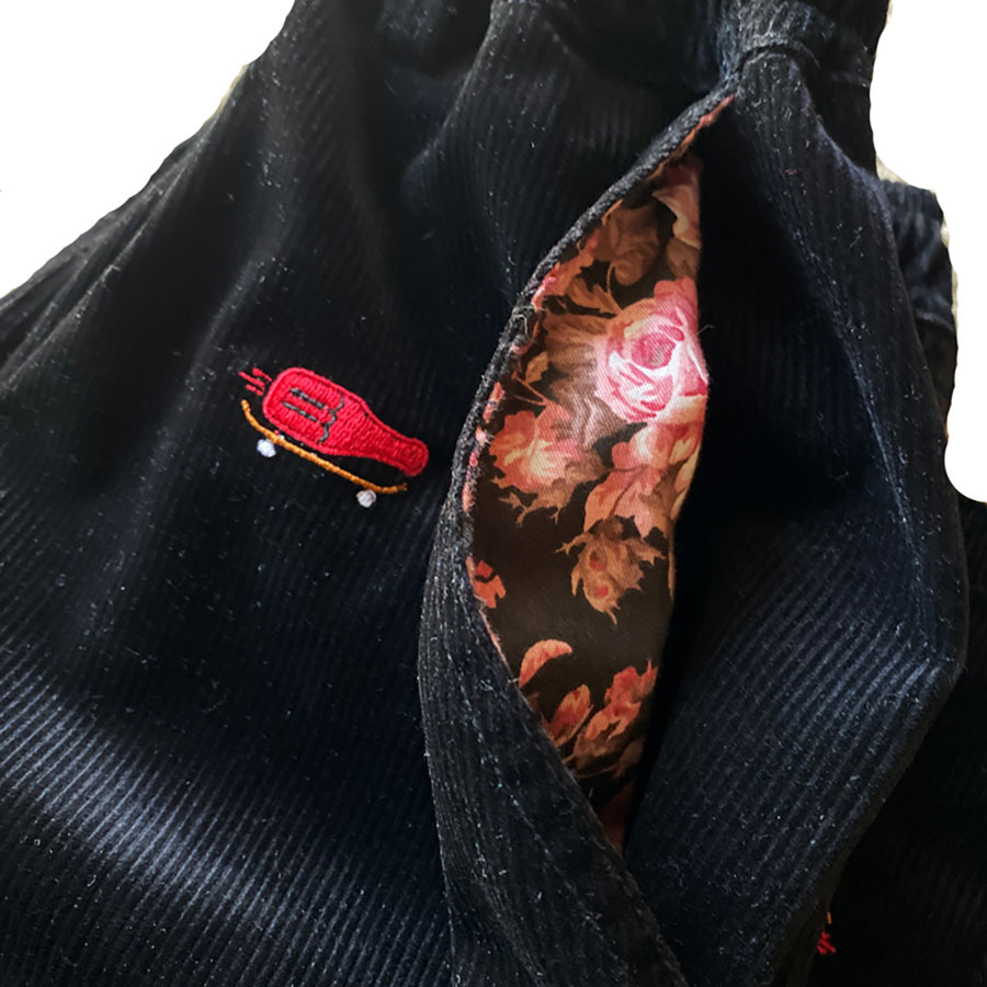 Skate Sauceのロゴやビデオカメラを全面に刺しゅう。