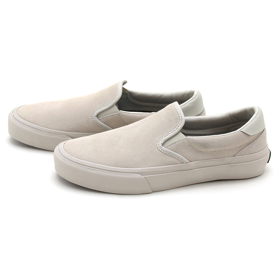 アイボリーのスエードキャンバスアッパーを用いたスリッポン。かかと部分を裏返すとメッセージがオン。¥6,264