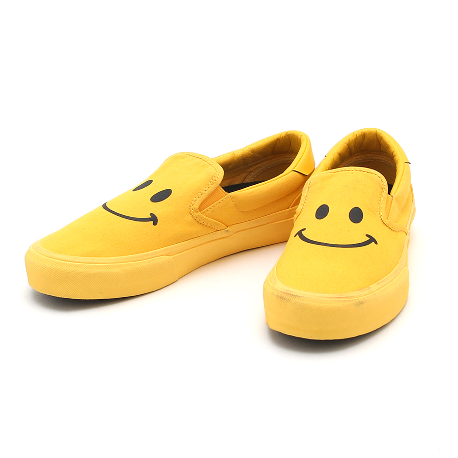 思わず顔もほころぶニコちゃんマークがキャンバスのアッパーにプリント。イエローの配色が足元を華やかに。¥5,400