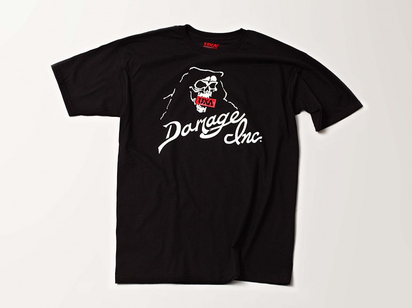 ガイコツとダメージという文字が攻撃的な一枚、Damage Inc Tee。¥5,040