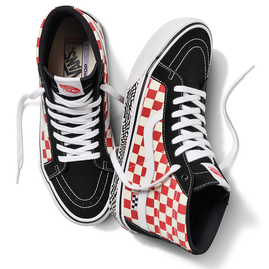 赤いチェッカー柄はPowell Peralta『Future Primitive』(’85)で履いていたもの。そしてパーム柄のカラーウェイは‘88年のSanta Cruz/Hosoi RocketsのADにて着用していたSk8-Hiがモチーフ。Skate Sk8-Hi Grosso ともに¥12,100