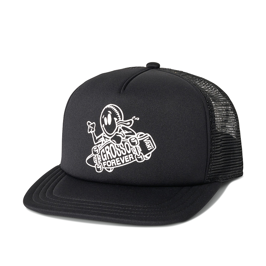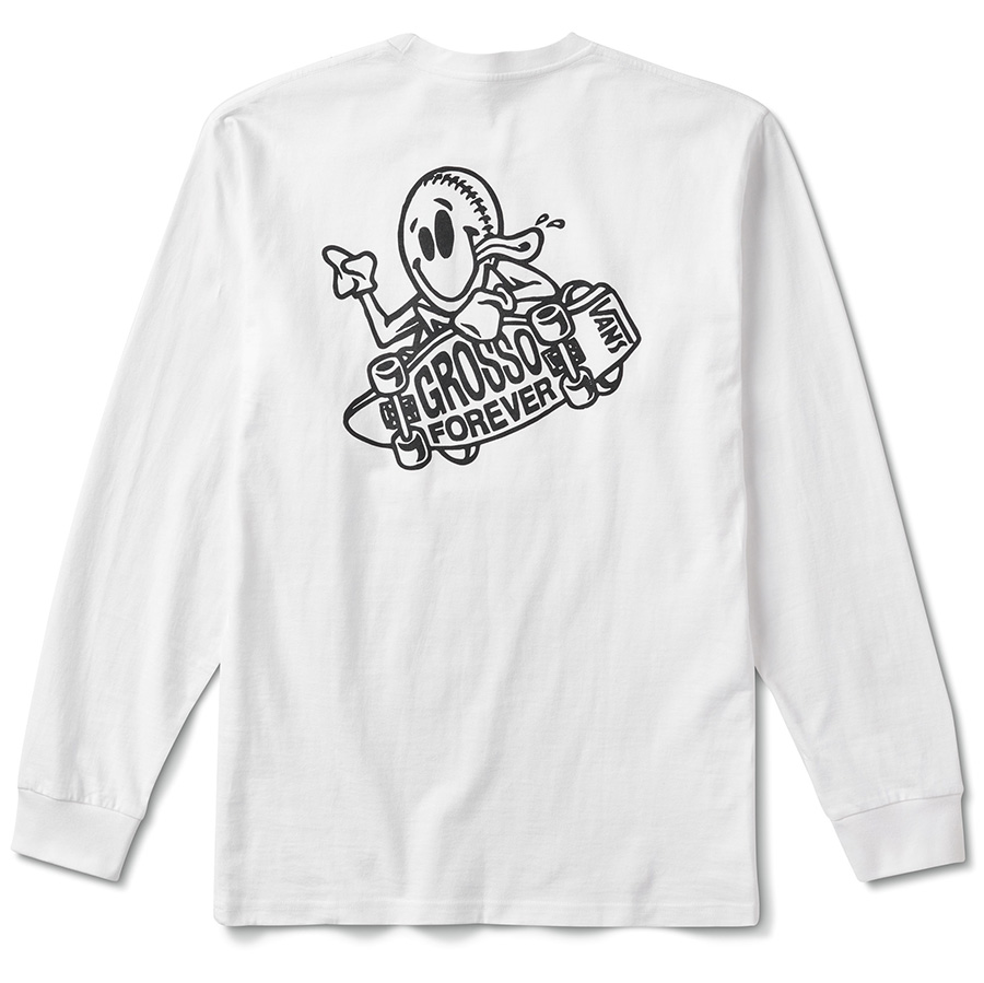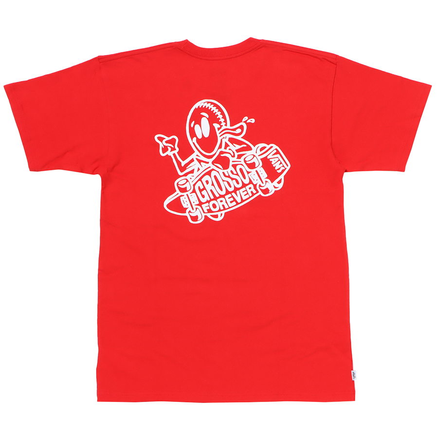 Grosso Foreverのアートワークを手掛けたのはジョン・ルセロ。Teeにはジェフが残した名言もプリント。M Grosso Skate LS White ¥5,500、M Grosso Skate SS Red ¥4,400、M Grosso Forever Trucker Black ¥3,850