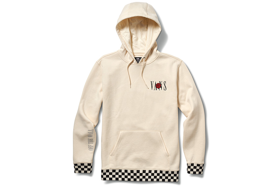 薔薇とロゴの刺繍を左胸に、スリーブにはVansのスローガン、そして裾にチェッカー。ブランドのすべてが凝縮したHoodie。¥11,000