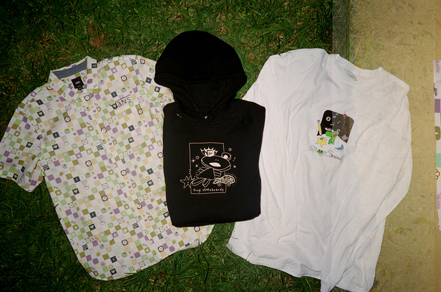 写真左から、Vans × Frog SS Woven (Frog) ¥7,700、Versa Standard Hoodie (Frog) ¥9,350、Vans × Frog LS (Frog) ¥5,500