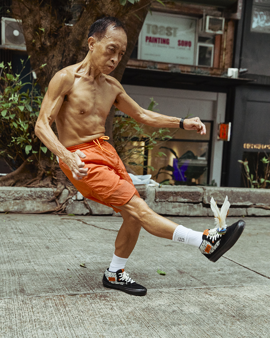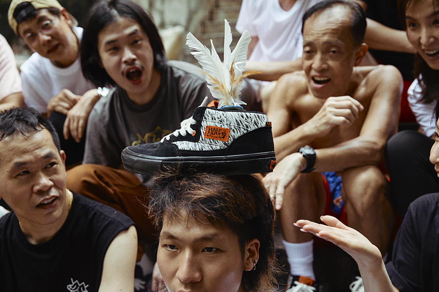香港で人気のシャトルコック(足でシャトルを蹴るバドミントンのようなもの)にインスピレーションを得て、彼らが集まる公園によく見られるガジュマルの根を柄で表現している。