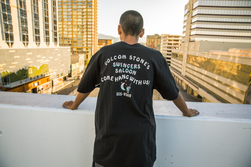 フロントの左胸にはStoneロゴとバニーガールをプリント。グラデーションがかった文字のバックプリントもポイント。左脇にはVolcomのロゴが入る。Swingers Saloon S/S Tee ¥3,780
