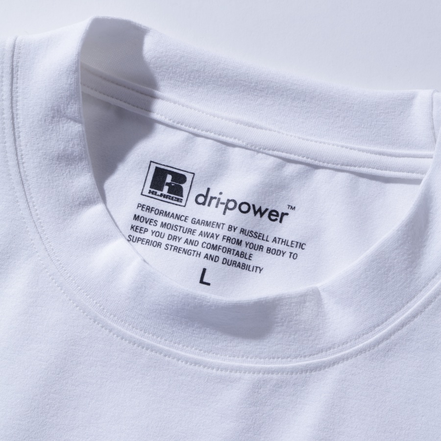 Russell Athleticが誇るDry-Power素材を用いたTシャツは速乾性に優れ、汗をかいても快適な着心地をキープ。