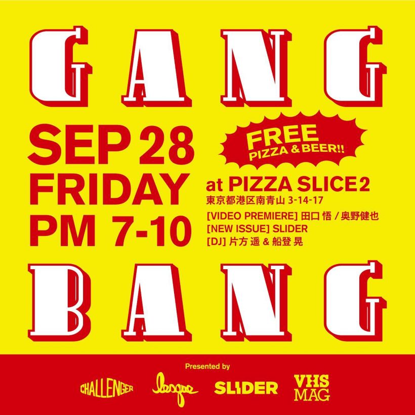 みんな大好きPIZZA & BEERのフリーパーティ。VHSMAGをチェックしてくれている高感度層(?)のアナタならすでにご存知かと思うけど、9月28日(金)の晩に青山のPizza Slice 2にてスケートの合同イベント、題して『GANG BANG』をやっちゃいます。