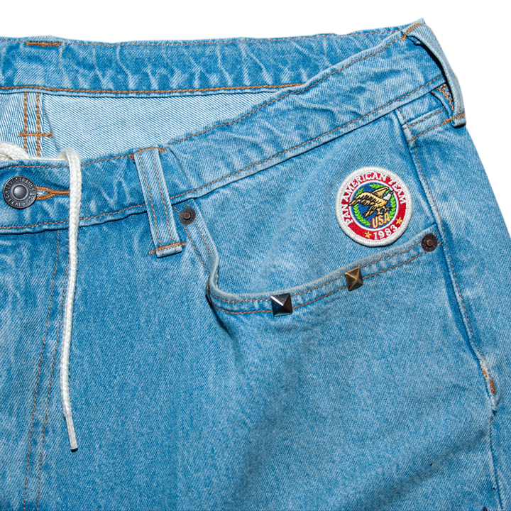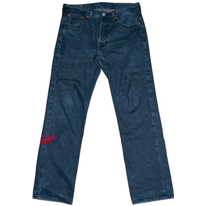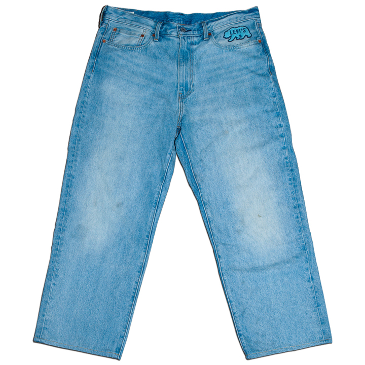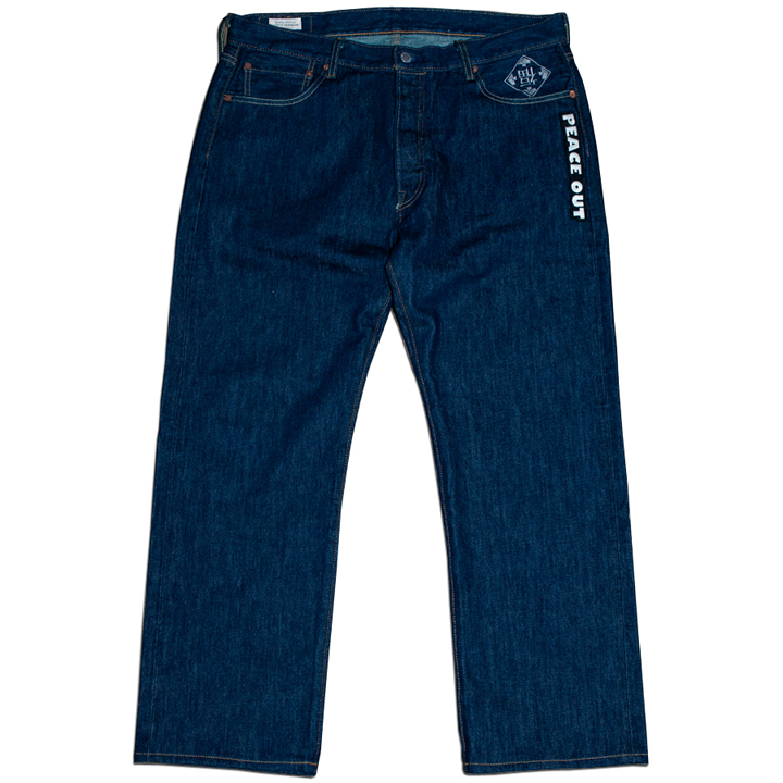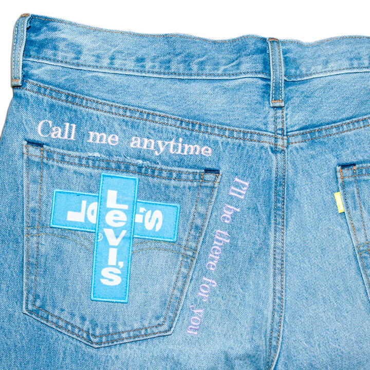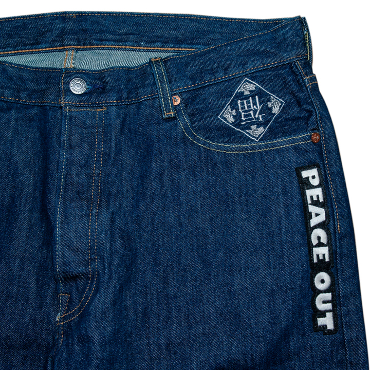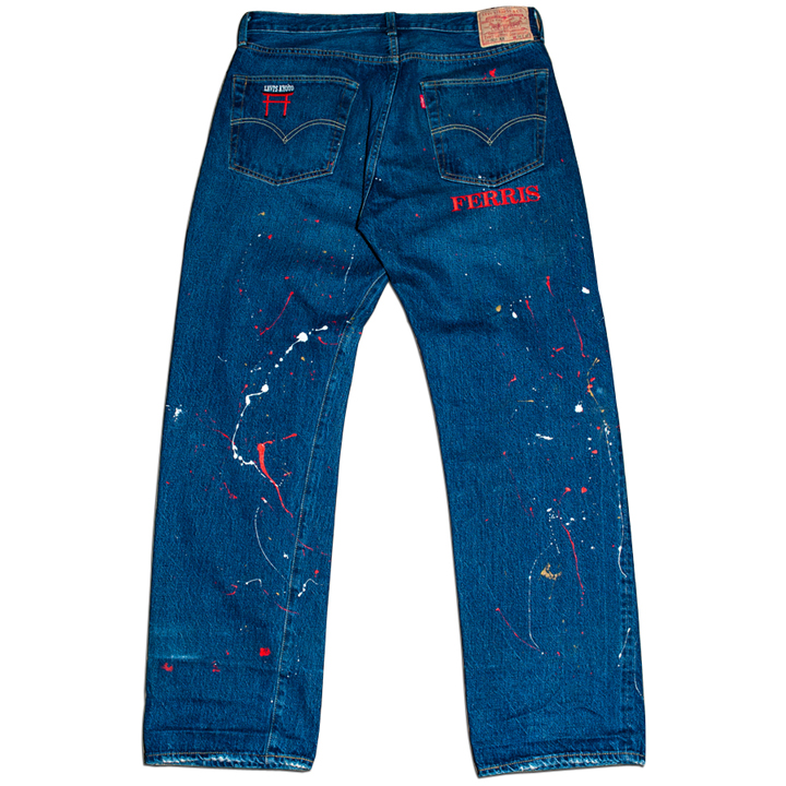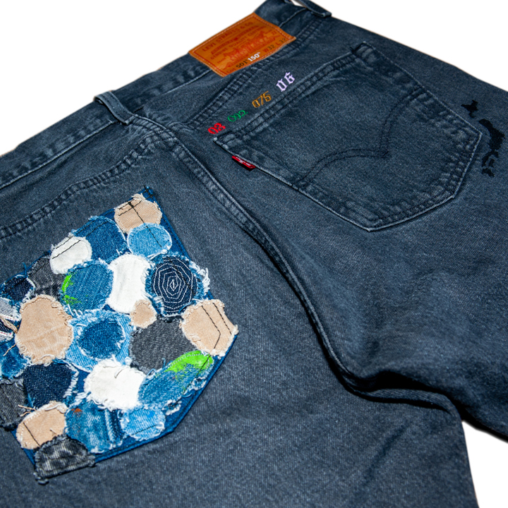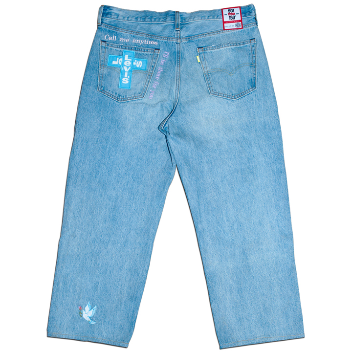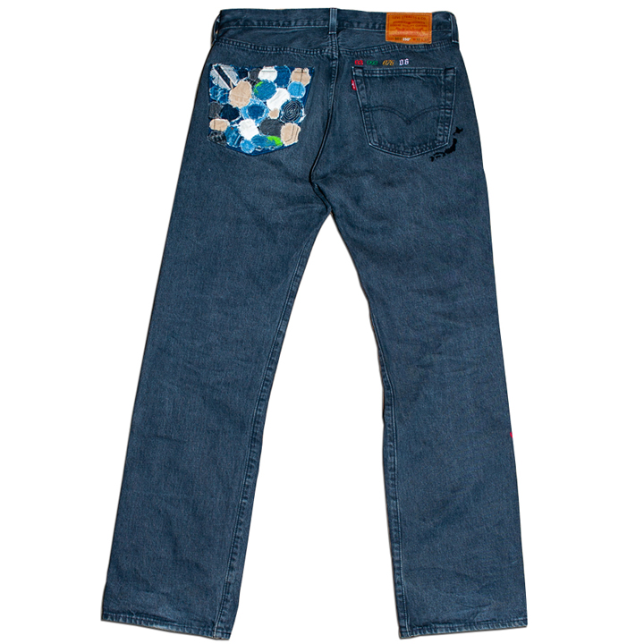 K: 僕はお尻のポケットに数字を入れたんですけど、これは行った場所の市外局番です。バックポケットの右下の日本地図は大阪限定。このパンツは501の150周年モデルです。