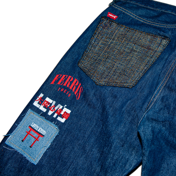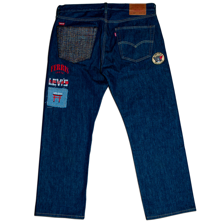 A: みんな選ぶものが違うから面白いんですよ。自分は行った街の限定モノを選びました。「福」というのは福岡、「大阪心斎橋」、「LEVI'S KYOTO」とか。ポケットも上から貼ったり。パンツは501です。