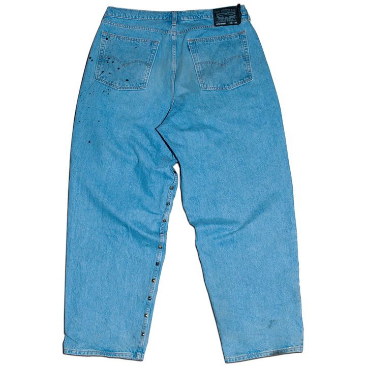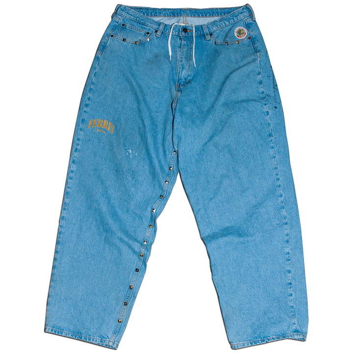 S: 自分はスケートラインのSuper Baggyです。脚が太いんで(笑)。脚の内側に交互に色違いのスタッズを付けました。大阪のテーラーさんに相談したら内側ならコケても痛くないしいい感じに見えるということで。