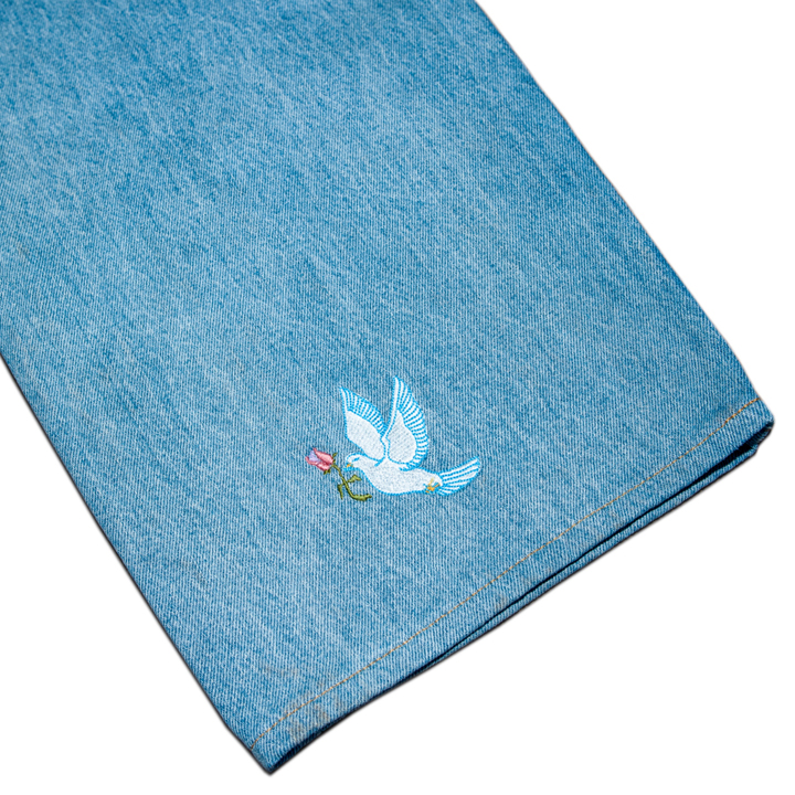 J: 僕は自分がクリスチャンというのもあって十字架を入れました。刺しゅうで入れた文字は「困ったらいつでも連絡してね。いつでも行くよ」みたいな。ちょっとかっこつけたヤツを作りたいと思って(笑)。あとバラをくわえた鳥は、ピンクのバラには感謝という意味があって、それを届けるみたいな。