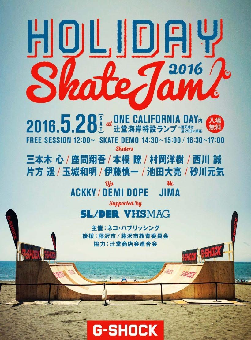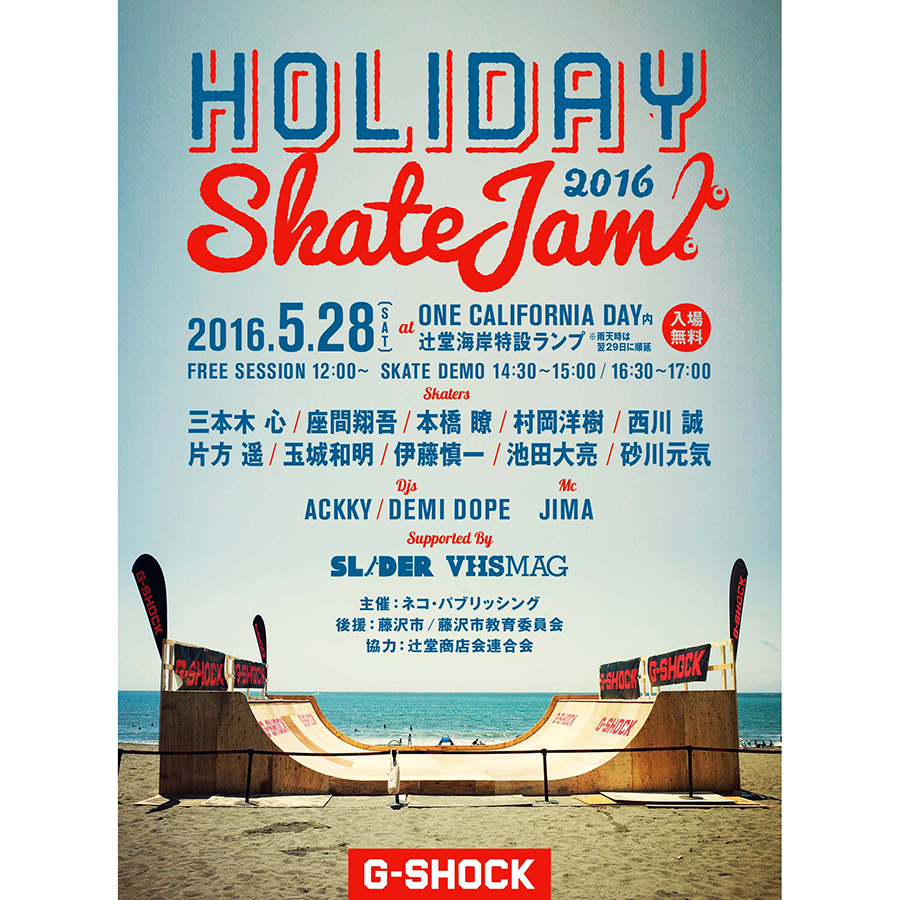 毎年5月最終週の週末に神奈川県藤沢市の辻堂海浜公園で行われるアメリカンカルチャーをコンセプトにしたネコ・パブリッシング主催のイベント、One California Day。そしてその会場である辻堂海浜公園から国道134号線を渡った辻堂海岸にミニランプを設置して行われるのがHoliday Skate Jam。