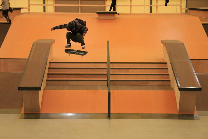 世界規格のジャンボサイズのセクションは、なんと全天候型。巨大テントの中で集中してトレーニングができる環境なので、通りすがりのオジサンや冷やかしの目を気にしないでスキルを磨けます。素材もセッティングもほぼほぼパーフェクトで、世界のコンペティションに向けてハイレベルな滑りを体現したい若者にはタマランチ会長。