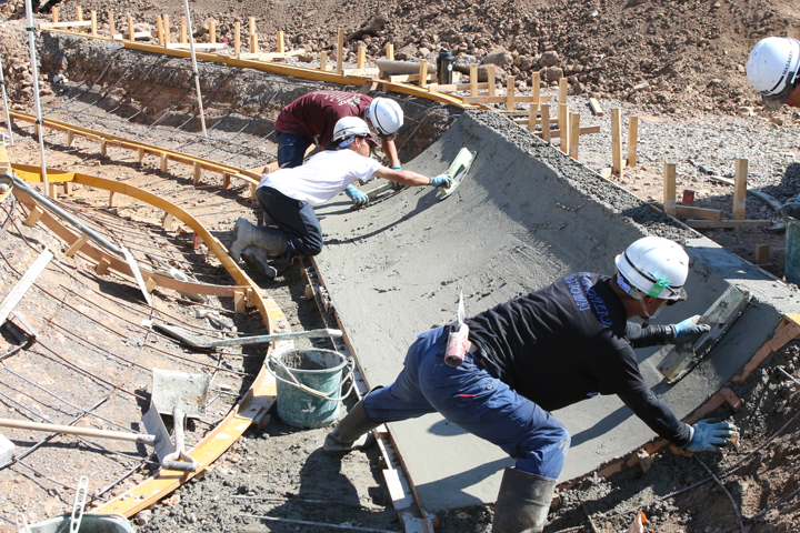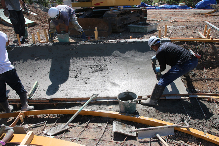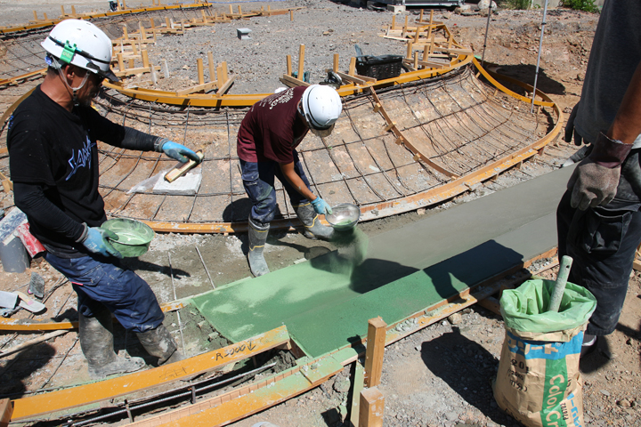 K: カラークリートはうちの渡辺班とか山田班はやったことがあるんですけど、吉澤班は初めてなんですよ。だからまず練習をして自分たちのやり方でやってもらった感じです。最初はコンクリートに色を混ぜるだけのタンクを用意しようという案もあったんですけど、そういう使い方をすると最終的にタンクを捨てることになっちゃうんで…。その請求を出すのは心苦しいな…と。かなりの金額がかかるんで(笑)。