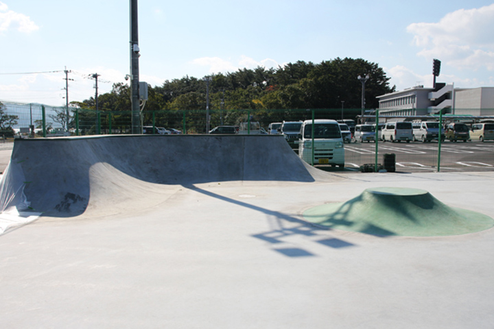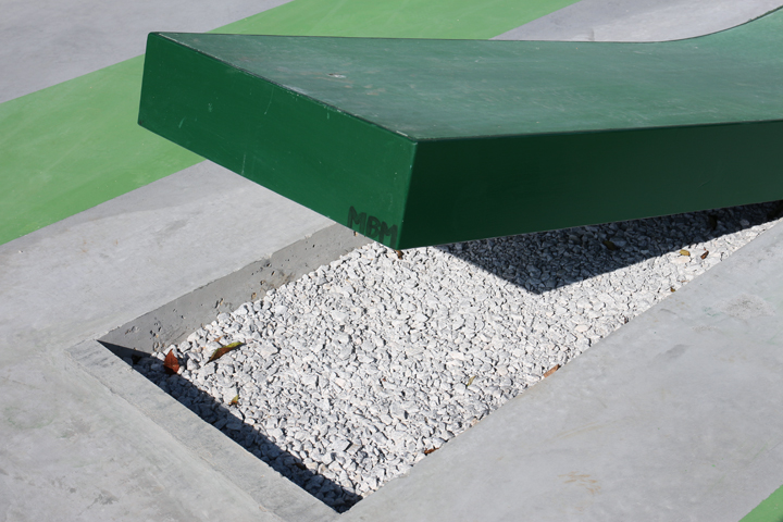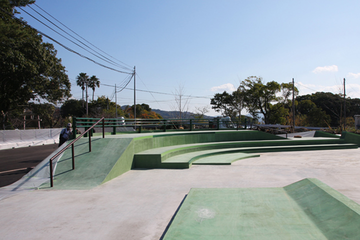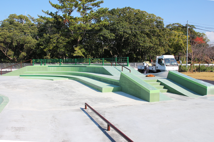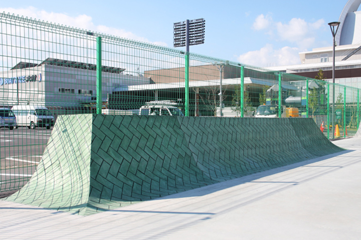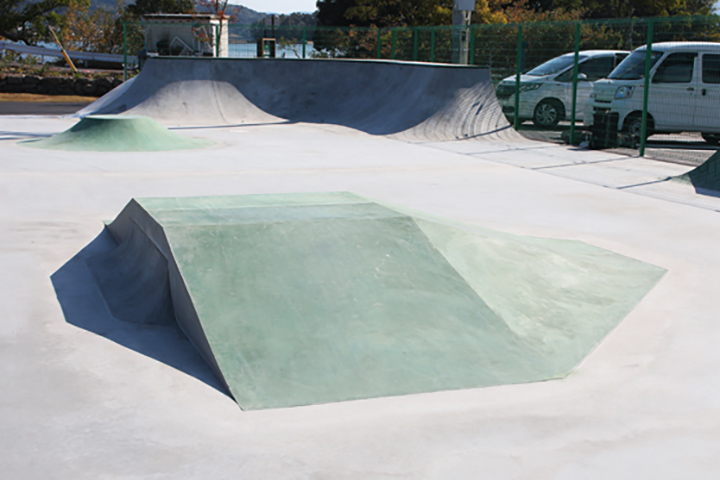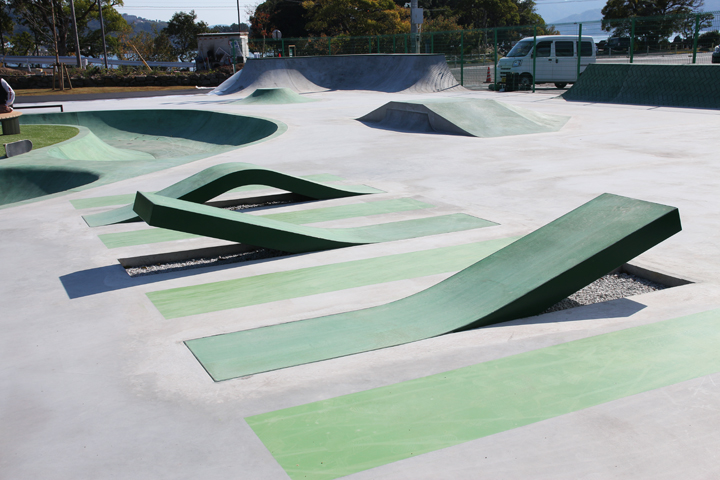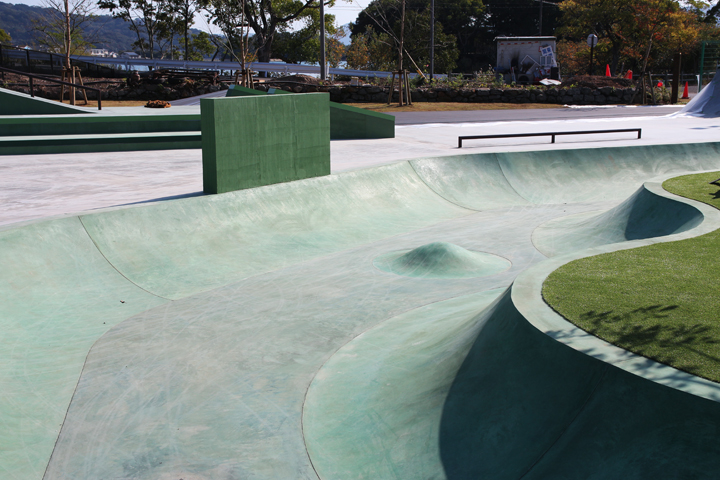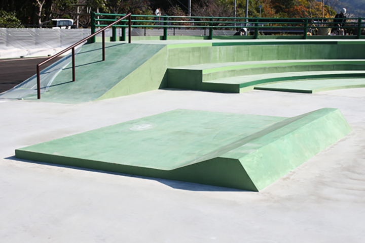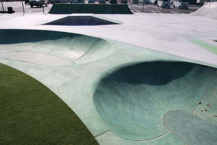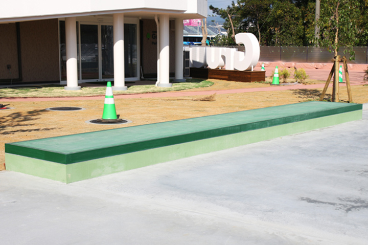 K: でも色をグリーンにするということで大理石とか御影石は使えなかったんです。色を塗るわけにもいかないし。ちなみにこれはコンクリートを2回打ちしてるんです。つまり1段目を打って、その上にもう1段打ってる。普通の建設屋さんだとL型のアングルを枠に張りつけて打っちゃうんですけど、そうするとちょっとした段差ができて仕上がりが悪くなっちゃう。それがイヤだから、うちはスケーターのことを考えて2回打つ。その辺のこだわりをやるかやらないかは、スケートパークビルドカンパニーか一般土木会社かの違いですね。