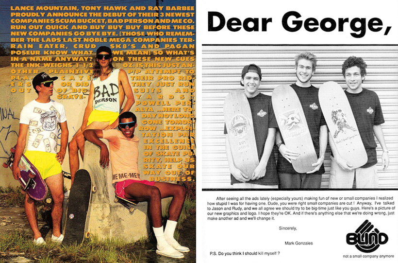 右は「拝啓ジョージ(・パウエル)さま、あなたは正しい! ということで大手の真似をすることにしました。僕らの新しいモデルの写真です。大丈夫ですよね? 何か問題があればまたアドで教えてください。PS - 僕は自殺したほうがいいかな? マーク・ゴンザレスより」とのBlindのアンサーアド。
