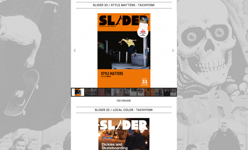 そして「ここがきっかけでSLIDERに興味を持ったけど、どこに売ってるのかわからない」っていうSLIDER難民のためのガイダンスとして、日本全国の取り扱いスケートショップリストも新たに設置。その名の通りSLIDERを取り扱うスケートショップのリスト(どんどん増加中)ですので、ここに掲載してあるショップに行けば雑誌が手に入るハズ。