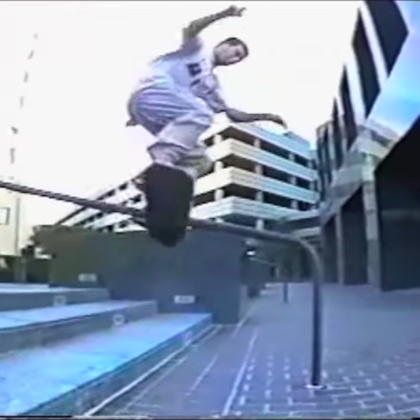あれから20年以上経っているのでまだそのレールがあるのかは不明ですが、ゴンズことマーク・ゴンザレスが『Video Days』にてボンレスからのダークスライドをかましているあのレールこそが、Taco Bell本社前のレールなのです。ヘェ~、ヘェ~、ヘェ~。