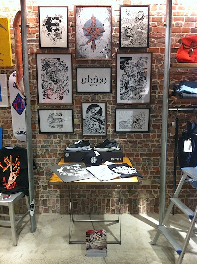 店内にはetniesのプロダクトに提供した貴重なアートワークの原画が展示され、その他の作品や会場限定のシルクスクリーンプリントが販売されている。野坂氏のアートワークは、etnies本国のスタッフが作品を見るやいなや、即コラボのGOサインを出したという逸話を持っているほど。今回のアートショーは、そんな野坂氏の作品を生で目にすることができる貴重なチャンス。原宿にお越しの際は、迷わずBEAMS原宿店2Fへ!