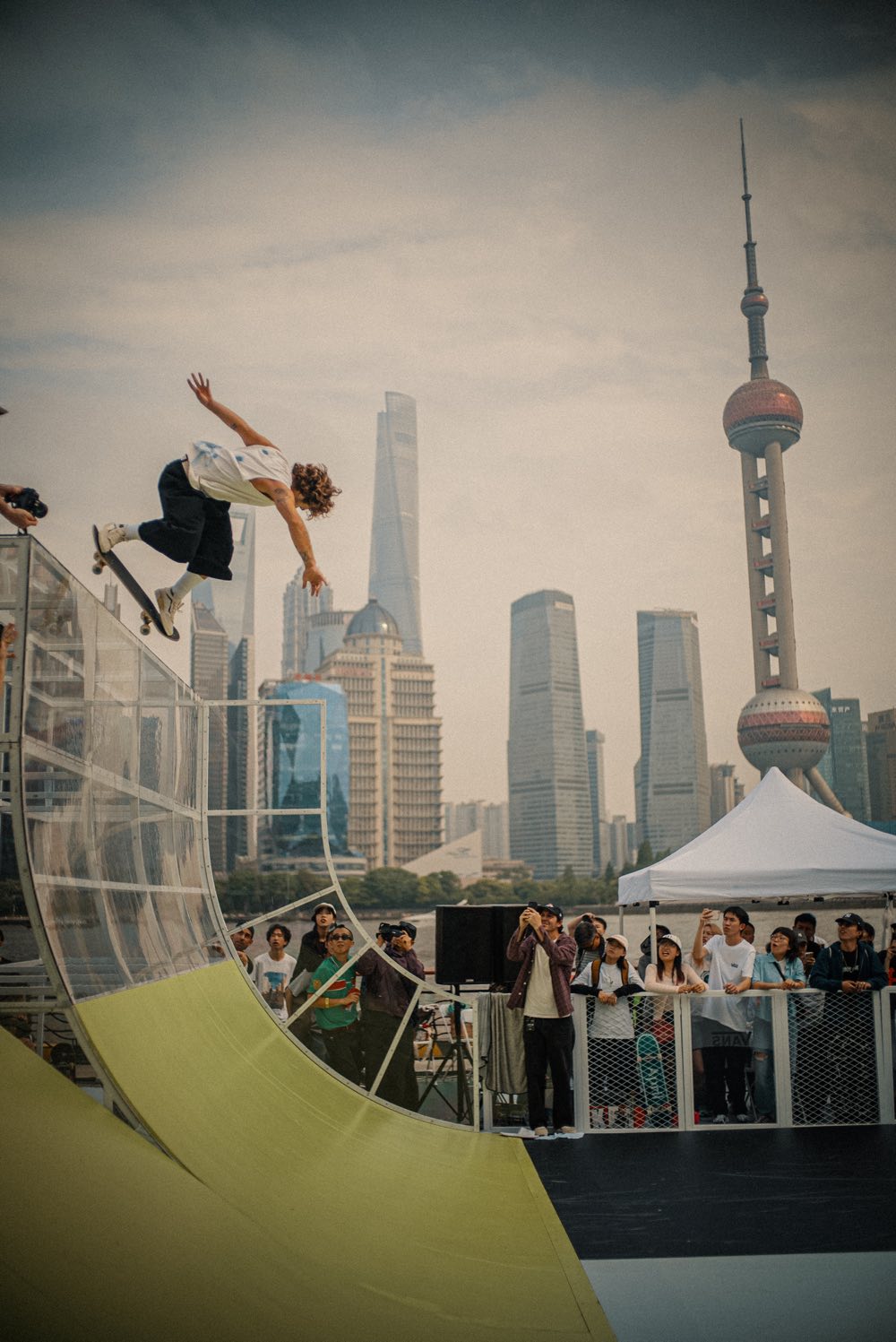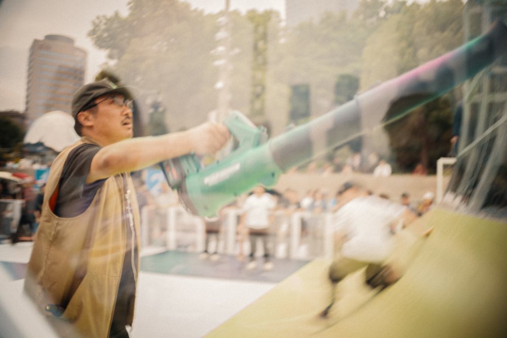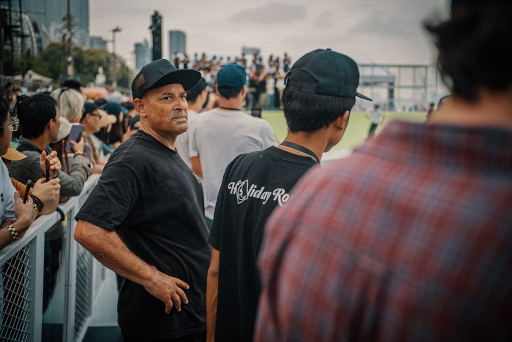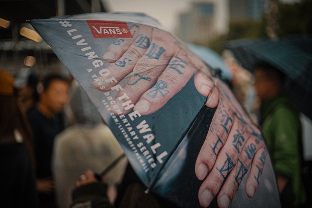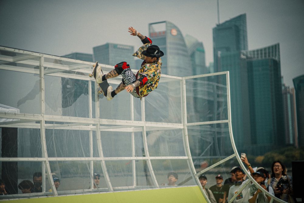 そして迎えたイベント当日。気象情報の予報通り、上海はあいにくの雨。たとえ小雨でも路面が滑ってしまうためデモ中止はほぼ確定。雨が降ったり止んだりを繰り返すなか、路面にたまった水を掃き続けるスタッフ。そして雨雲が途切れたタイミングでスケジュールを前倒しにして急遽デモ開始。アルヴァがコースをクルージングし、ホソイやオマーが往年のスタイルで魅せる。カレン、ディエゴやデルフィーノもそつなくデモをこなし、極めつけはペドロ・バロス。デモの途中で姿を現し、そこからは独壇場。クリアの特大クオーターで次々とぶっ飛ぶ始末。通行人も足をとめてデモに釘付け。そして会場が大歓声に包まれ無事にデモが終了した瞬間、突然の大雨。まさに奇跡の60分。