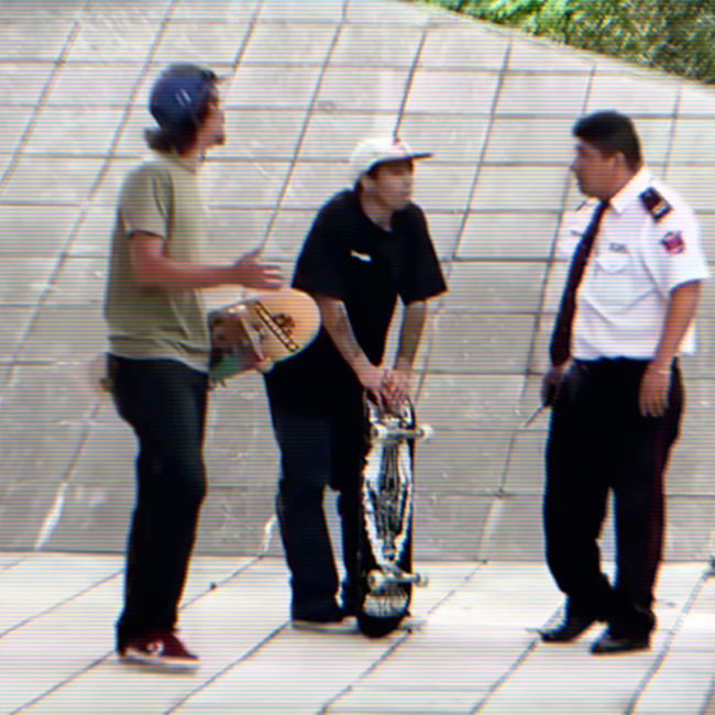 スケーター側の目線で考えると、スケートを阻止する警備員はとにかく邪魔な存在。なかにはいい人もいますが、基本頭ごなしに怒ってくるので敵認定をしたくなるところ。メイクを求め真剣にスケートをしている最中に追い出されるのだから頭に来るのはわかるんですが、ちょっと考えてみてください。警備員はビルや施設のオーナーから依頼され、その場所を警備するのが仕事。そしてスケーターは他人の敷地に勝手に入って施設内をゴリゴリ傷つける存在。どちらに正義があるのかは一目瞭然。グラインドで傷付けたレッジやハンドレールの損害賠償を請求されないだけありがたい…と考えたほうがいいのではないでしょうか? ビデオなんかでは大勢のスケーターが警備員を囲んで騒いだりするシーンがあり、とても臨場感があるのですが日本の場合警備員は大体5・60代のおっちゃんが中心。そんな高齢者に若者が多人数で絡んでどうするのよ? って感じ。個人的には弱いものいじめみたいで好きじゃないっす(ウケるやつは除く)。