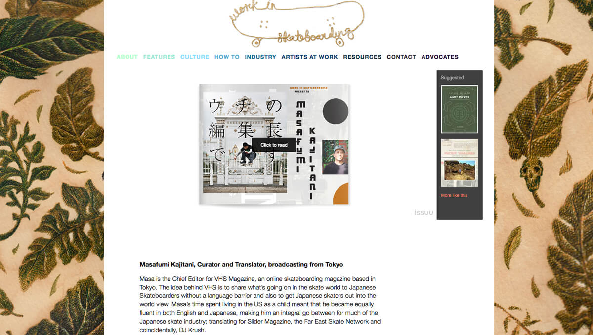 スケートボードインダストリーに関わるさまざまなクリエイターや裏方などをフォーカスしたウェブサイト、Work in Skateboarding。アメリカのTransworld Skateboardingのシニアフォトグラファーであり、親日家としても知られるデイブ・カミの奥さんが手がけているというこのサイトに、我らがVHSMAG編集長の梶谷が特集されております。