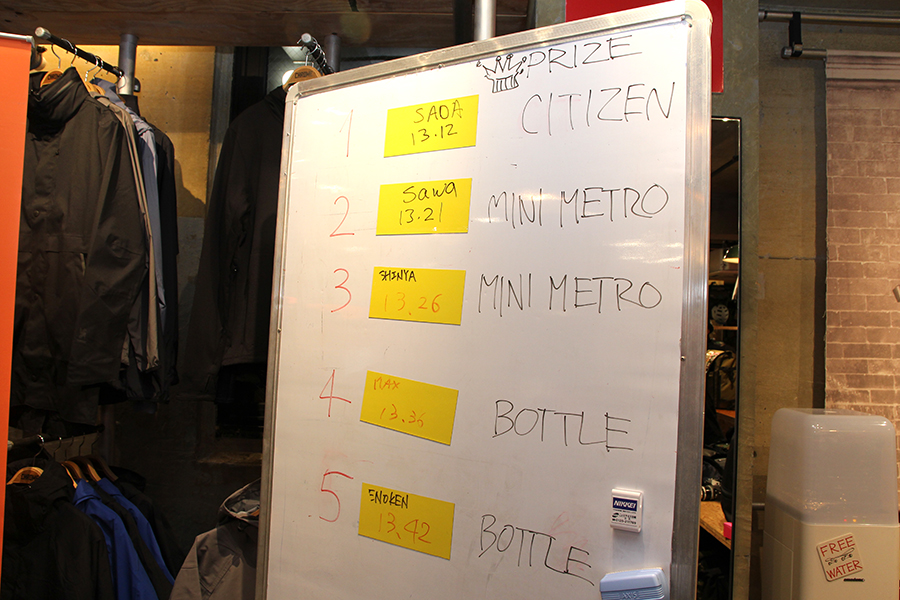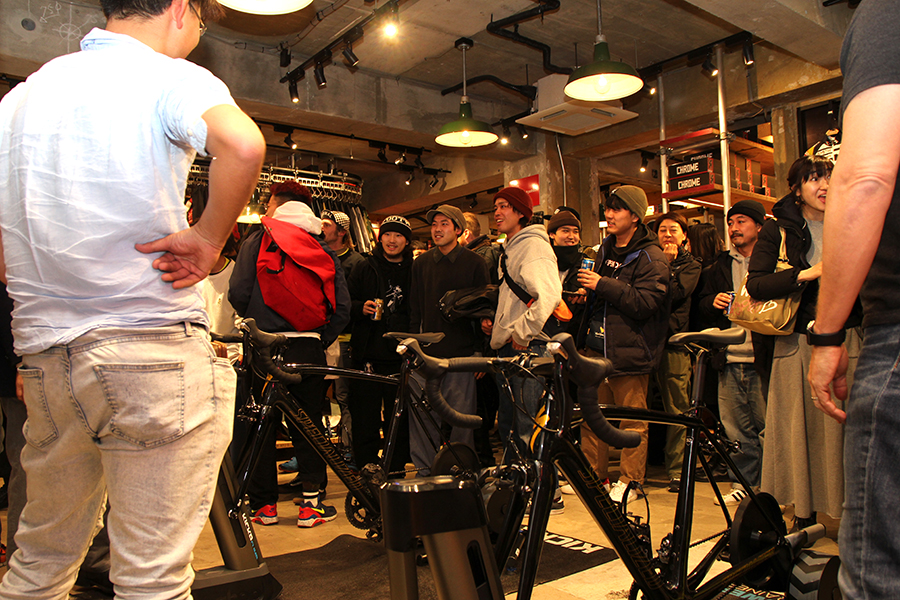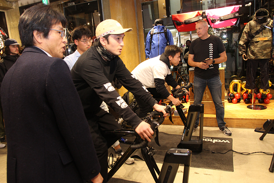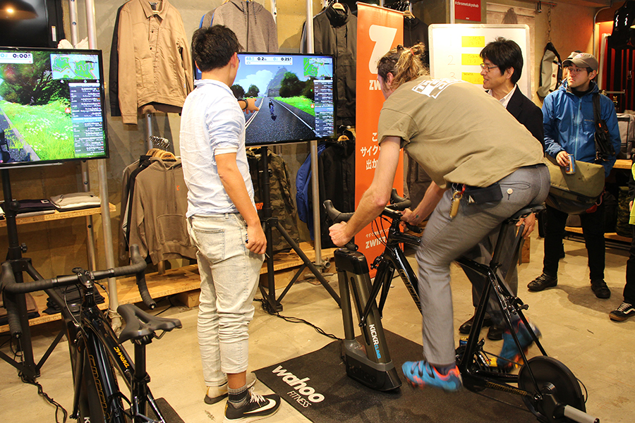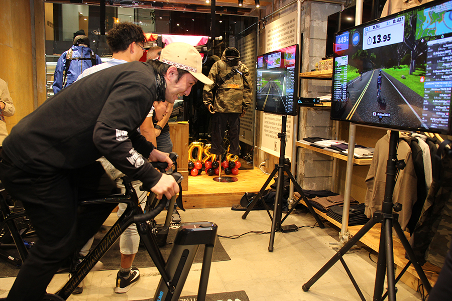 店内には世界中のサイクリストたちと連携できるZWIFTのトレーニングゲームが設置。来場者によるタイムトライアルが行われ、上位入賞者には豪華プレゼントが贈呈されるとあって大盛り上がり。