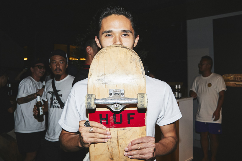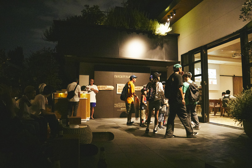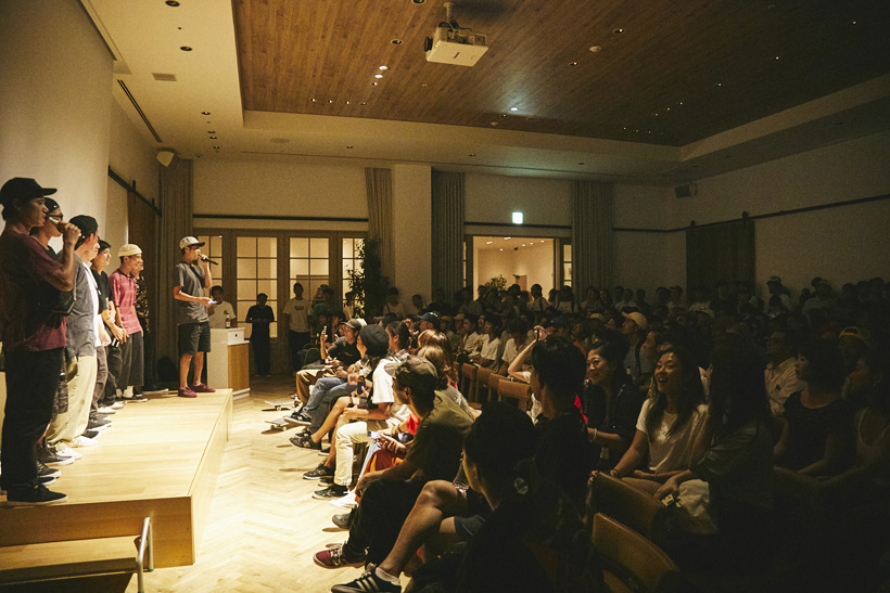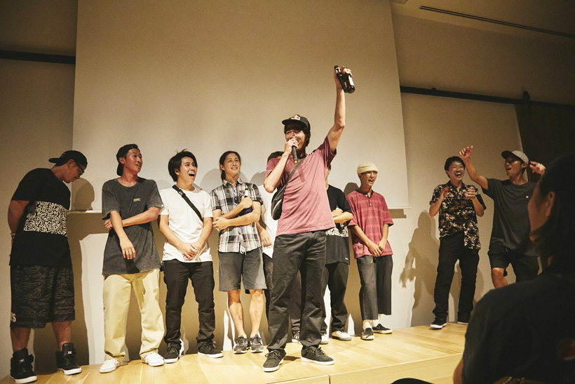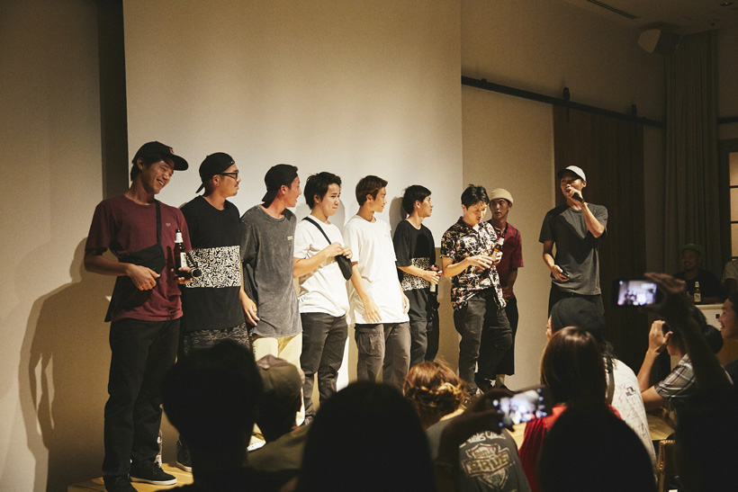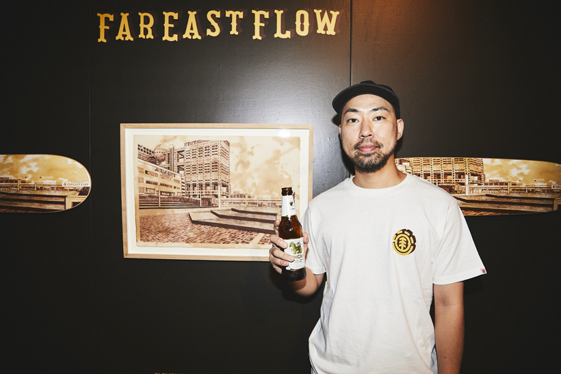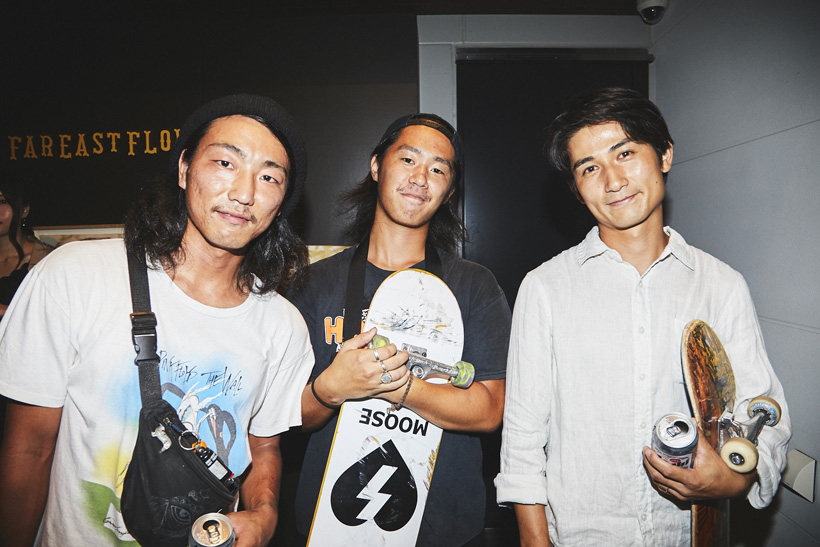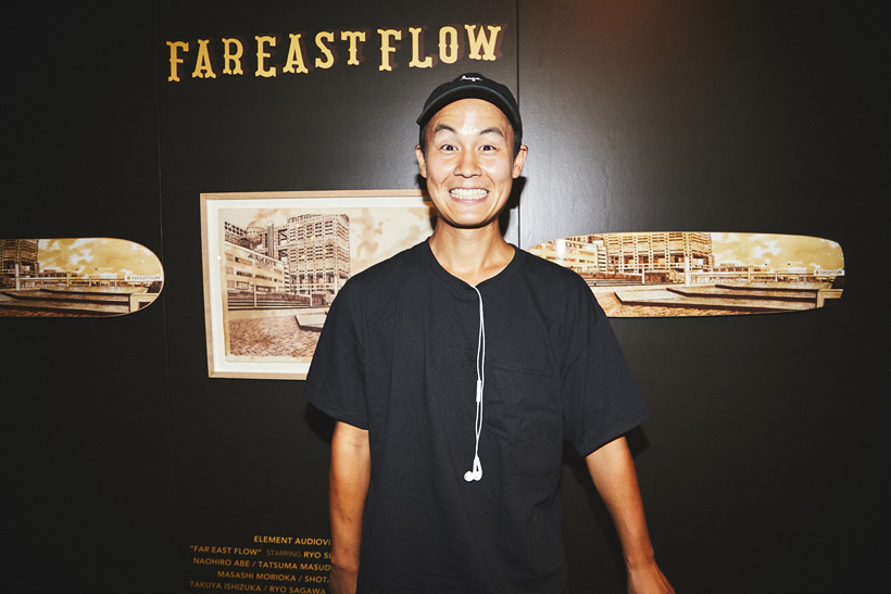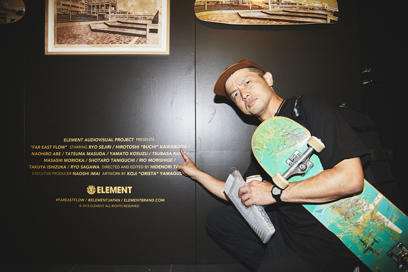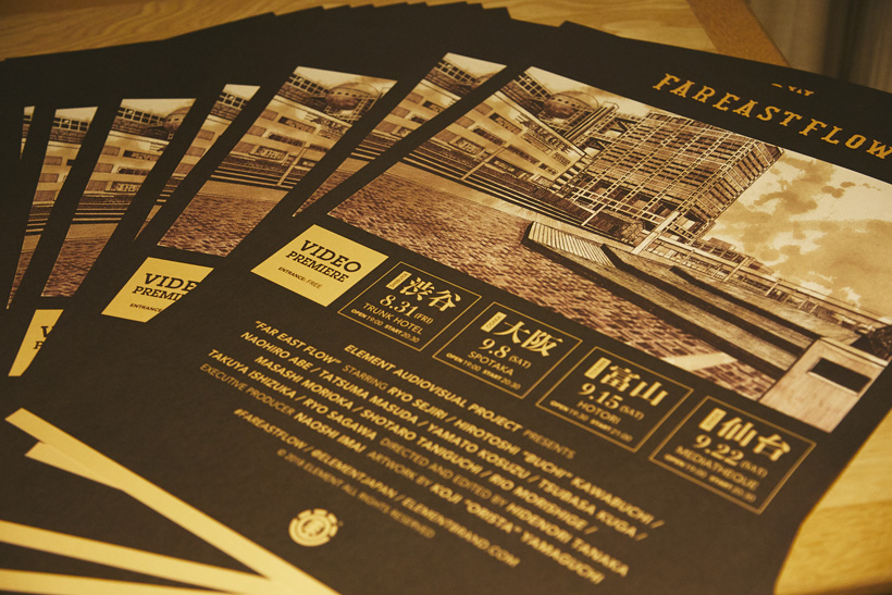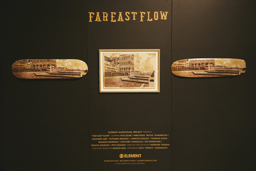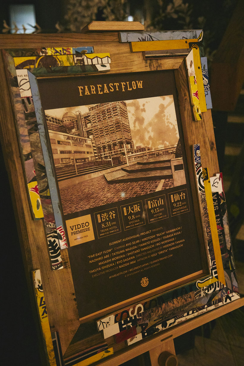 Element Japanの初フルレングス『Far East Flow』の東京試写会が8月31日(金)に渋谷Trunk Hotelで開催された。会場となった同ホテルのイベントスペースには、オリスタこと山口幸士がグラフィックを手がけたリリース記念ボードやその原画、ライダーたちのライディング写真などが展示。洗練された空間には多くのスケーターが集まり、フリードリンクを手にElementジャパンチームの記念すべき作品に大喝采が沸き起こった。なお、本作の試写会は今回の東京を皮切りに、大阪、富山、仙台と巡礼するのでスケジュールをチェックしてお近くの会場へGO!