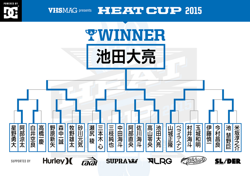 VHSMAGプレゼンツのスケートコンテスト“HEAT CUP 2015 at H.L.N.A SKATEPARK powered by DC”が8月22日に開催された。日本屈指の24名のスケーターが会場に特設されたセクションを駆使し、1対1のジャムセッション形式で行われた今回のイベント。