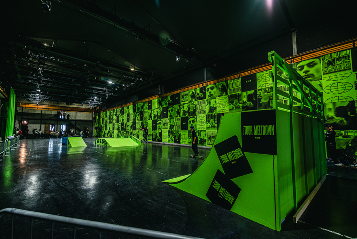 壁一面を覆い尽くすアートワークとグリーンのセクションでHUFの世界観を表現。