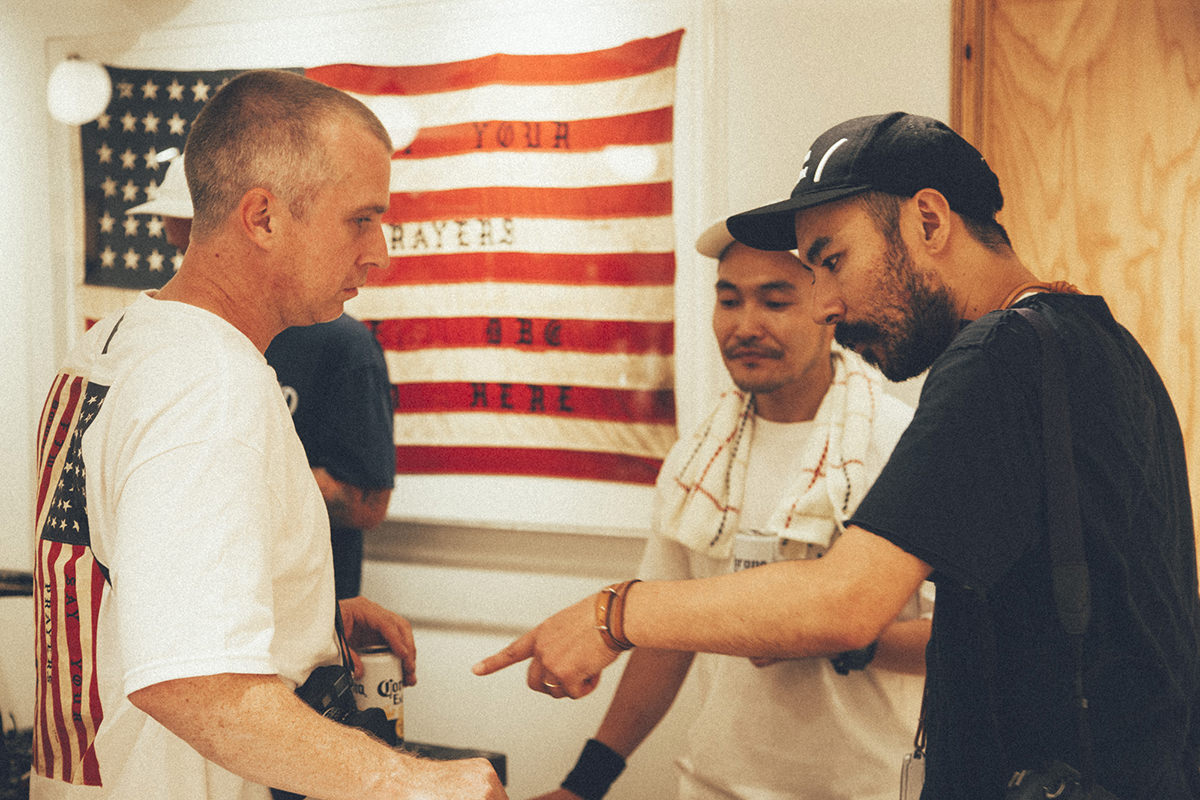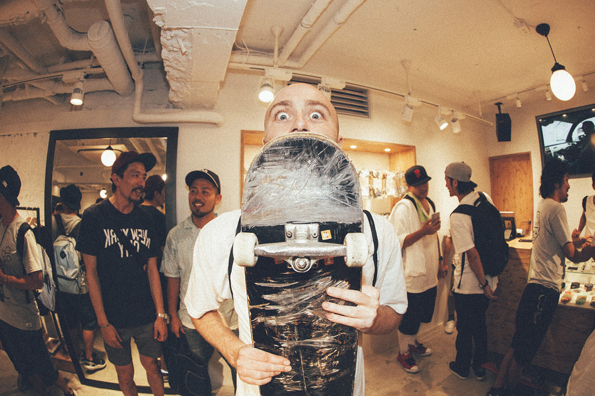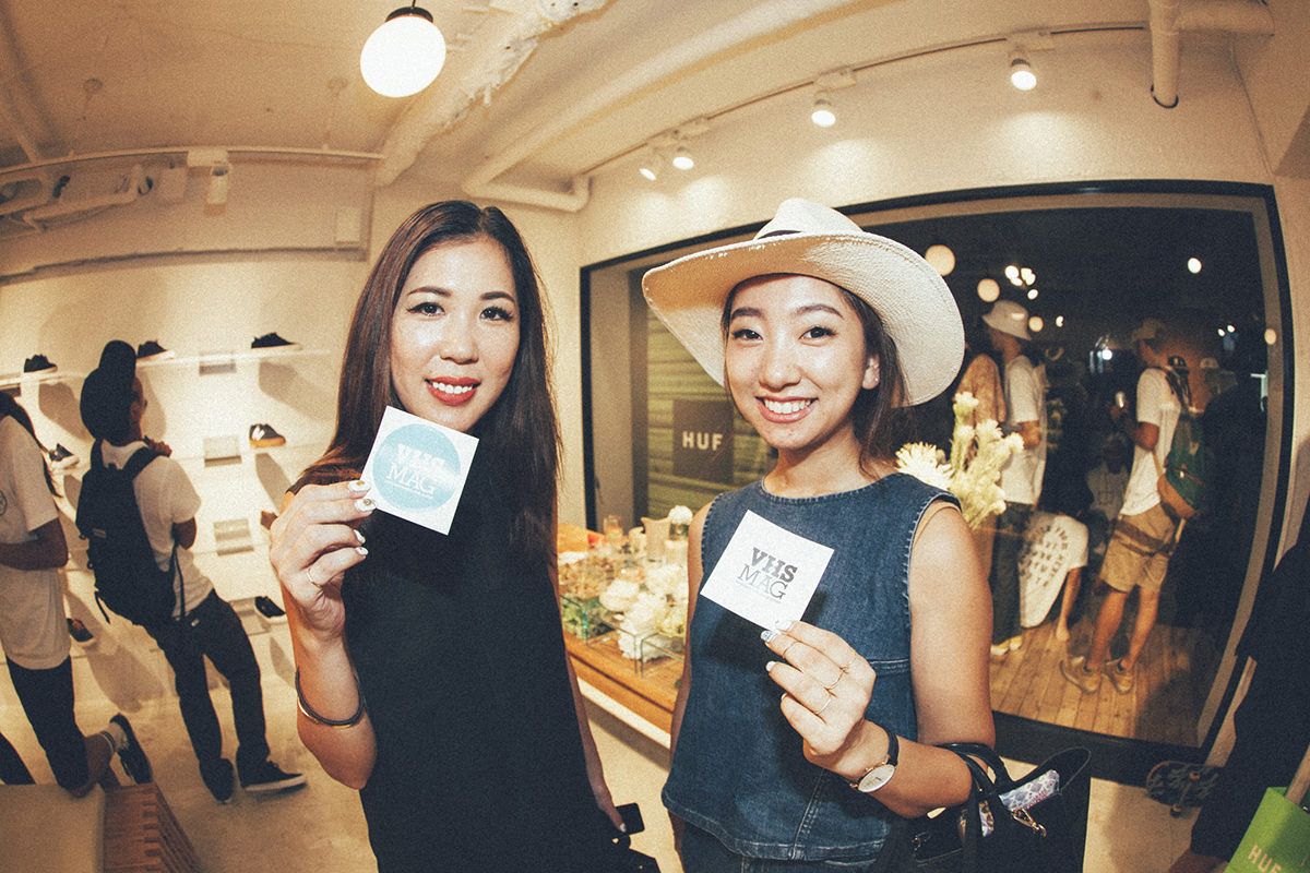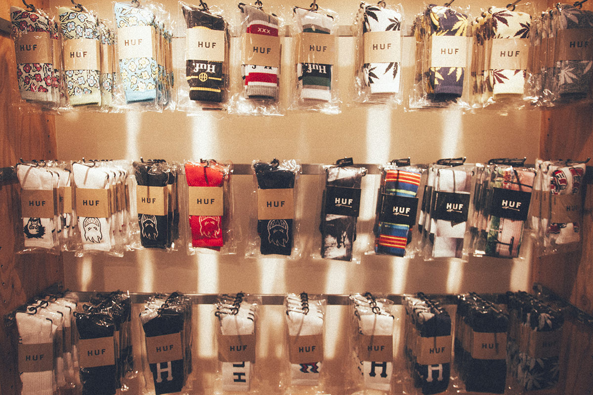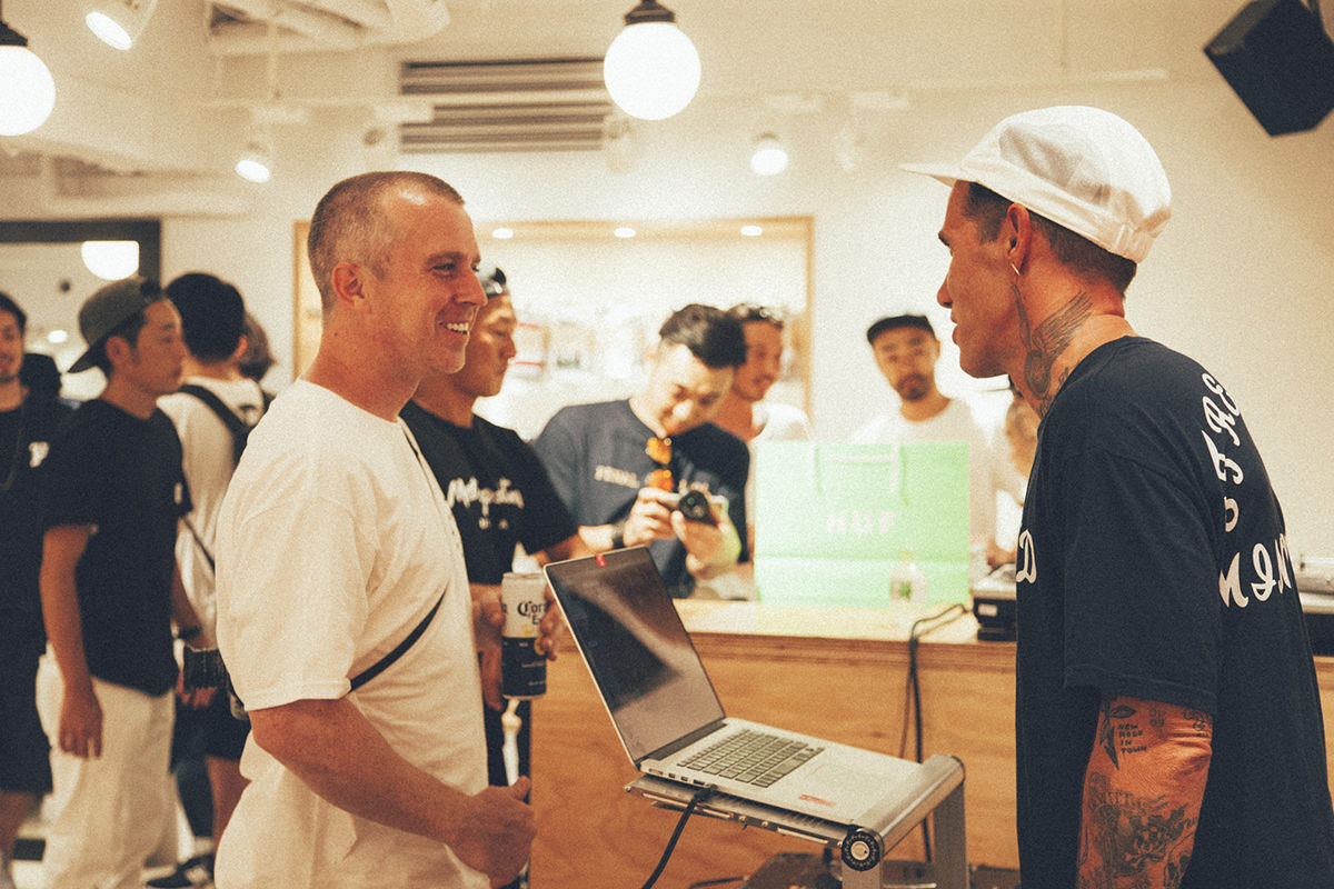 7月31日(金)にはHUF TOKYOのオープンを翌日に控え、オープニングレセプションが開催。当日はLAのHUFヘッドクオーターよりブランドディレクターであるキース・ハフナゲルと、HUF TOKYOのアートワークとしてヴィンテージフラッグを手掛けたLA在住のアーティスト、カリ・ソーンヒル・デウィットが来場。会場は多くの来場者で賑わい、それぞれがDJプレイ、フリードリンクとフリーフードを楽しみながら大盛り上がり。また店頭にはベンディングマシーンが設置され、来場者にHUFのソックスがプレゼントされたりと豪華な一夜となった。