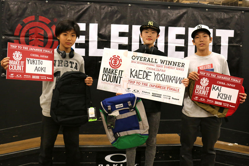 Elementが主催するアマチュアコンテストシリーズ、Make It Count 2016の国内第4戦が5月29日(日)に千葉県市川市のUNIONスケートパークで開催。今回はInstantとの共同開催とあり、80名を越えるエントリーで行われた。コンテストの結果は12歳以下クラスは青木勇貴斗、13歳以上クラスは吉川 楓が優勝。