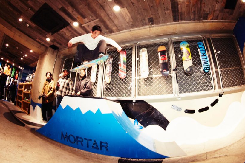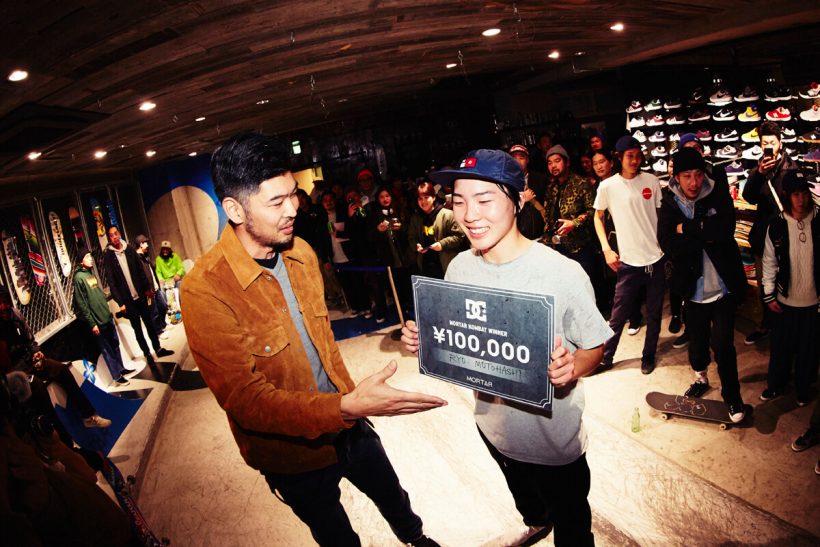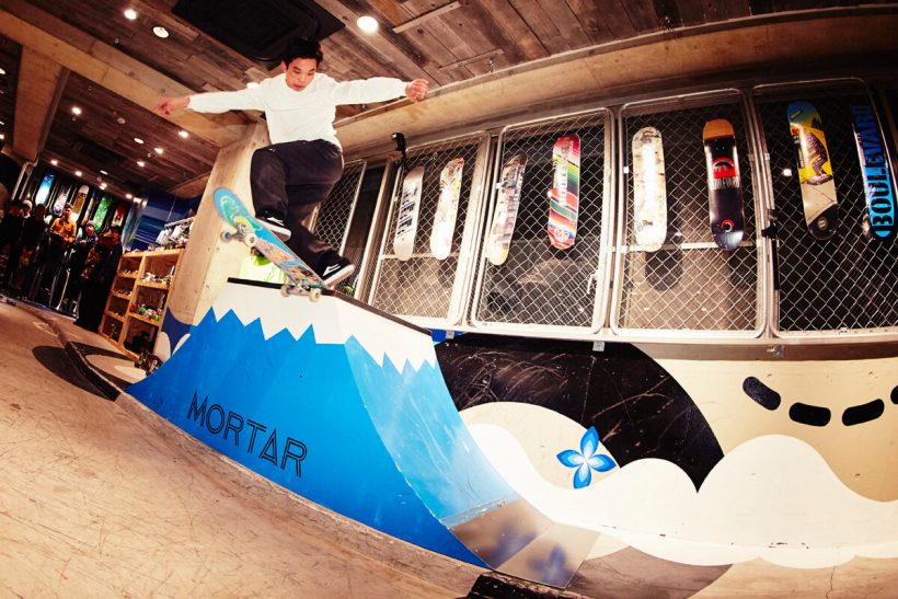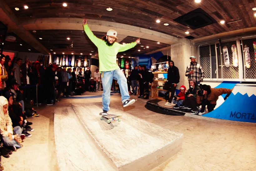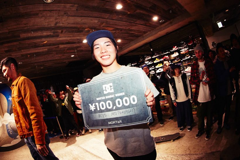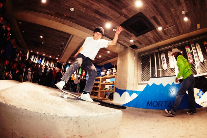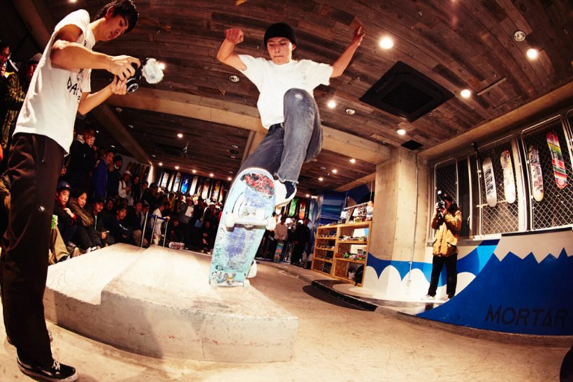2月15日(水)に、渋谷のMortarにてDC主催のコンテスト“Mortar Kombat”が開催された。本コンテストはMortar店内のセクションを使用し、ジャムセッション形式でスキルを競うというもの。当日はジャパンツアー中のBoulevardチームも来場。ティアゴ・レモス、砂川元気、高橋一慶、玉城和明、内藤寛人、星野大喜、村岡洋樹、本橋 瞭、山城正隆、吉岡賢人の選抜メンバー10名で白熱したバトルが繰り広げられた。会場には溢れんばかりの観客が駆けつけカオス状態となり、なかなかバトルがスタートできないという場面も。そんな中、ファイナルへと駒を進めたのは、砂川元気、高橋一慶、本橋 瞭、吉岡賢人の4名。各ファイナリストが持ち前のトリックを披露しオーディエンスの熱気はマックスに。ジャッジ泣かせの甲乙つけがたいバトルの結果、難易度の高いトリックを連発した本橋 瞭が優勝賞金10万円を獲得。スケートシーンの未来を担う若者と、来日中の海外スケーターとが交流を深めた素晴しいイベントとなった。