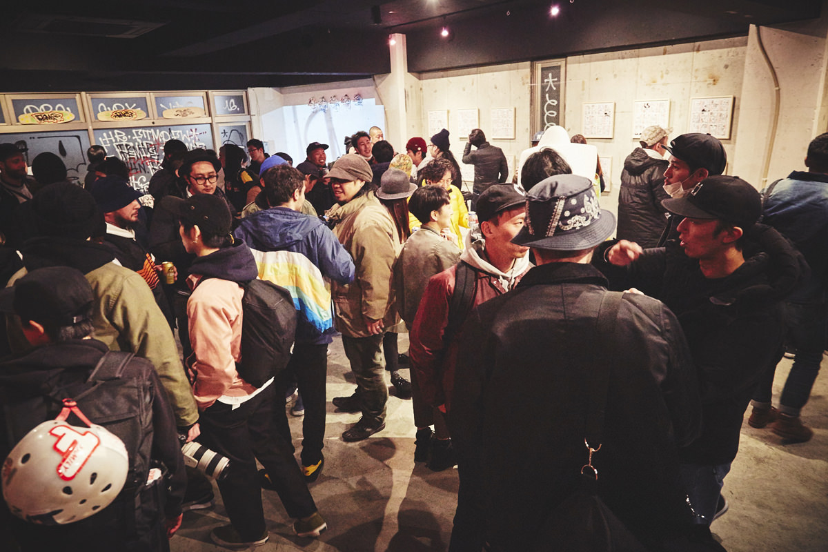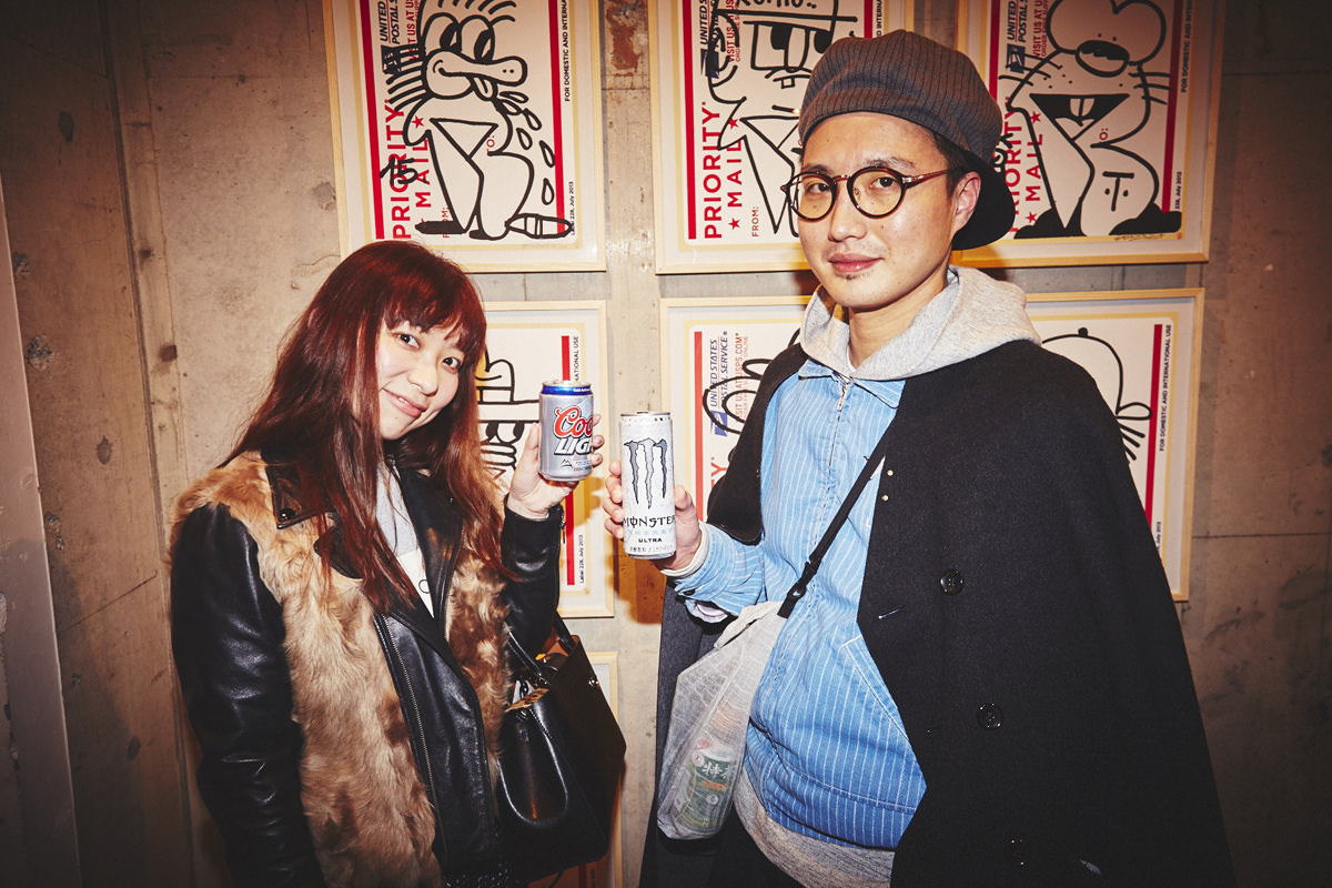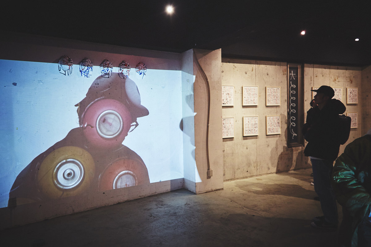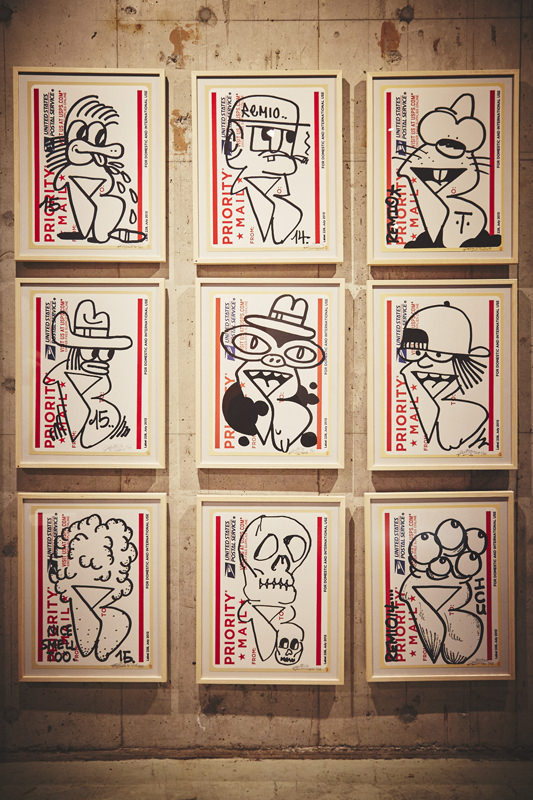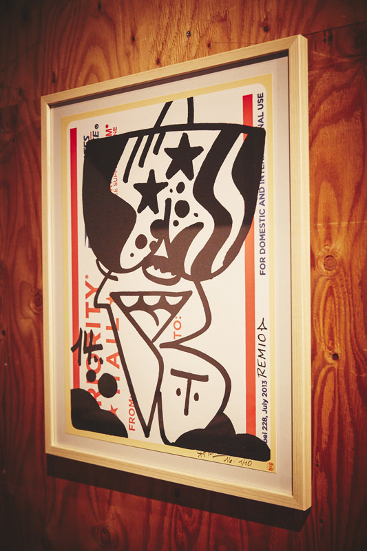 会場の窓にはREMIOによるグラフィティ、室内には3Dアート作品やシルクスクリーンポスターが展示され、来場者がドリンクを片手に展示を楽しんでいた。