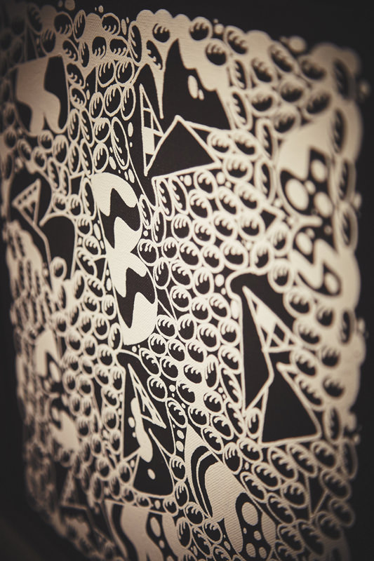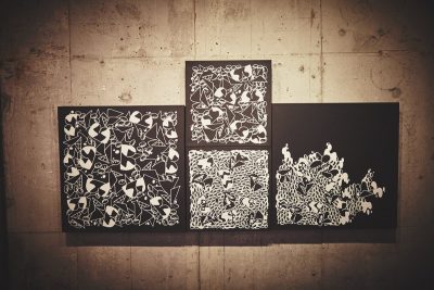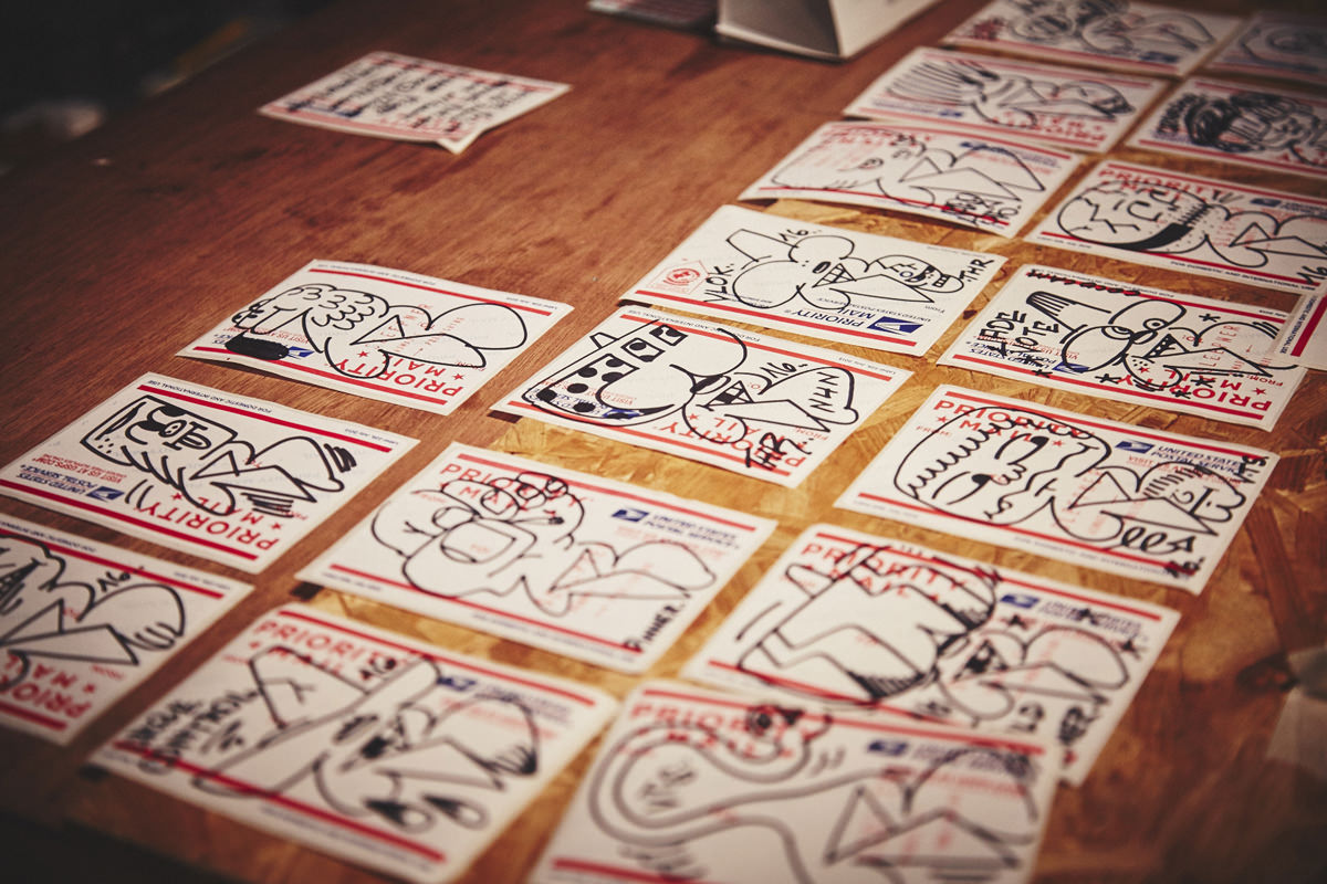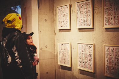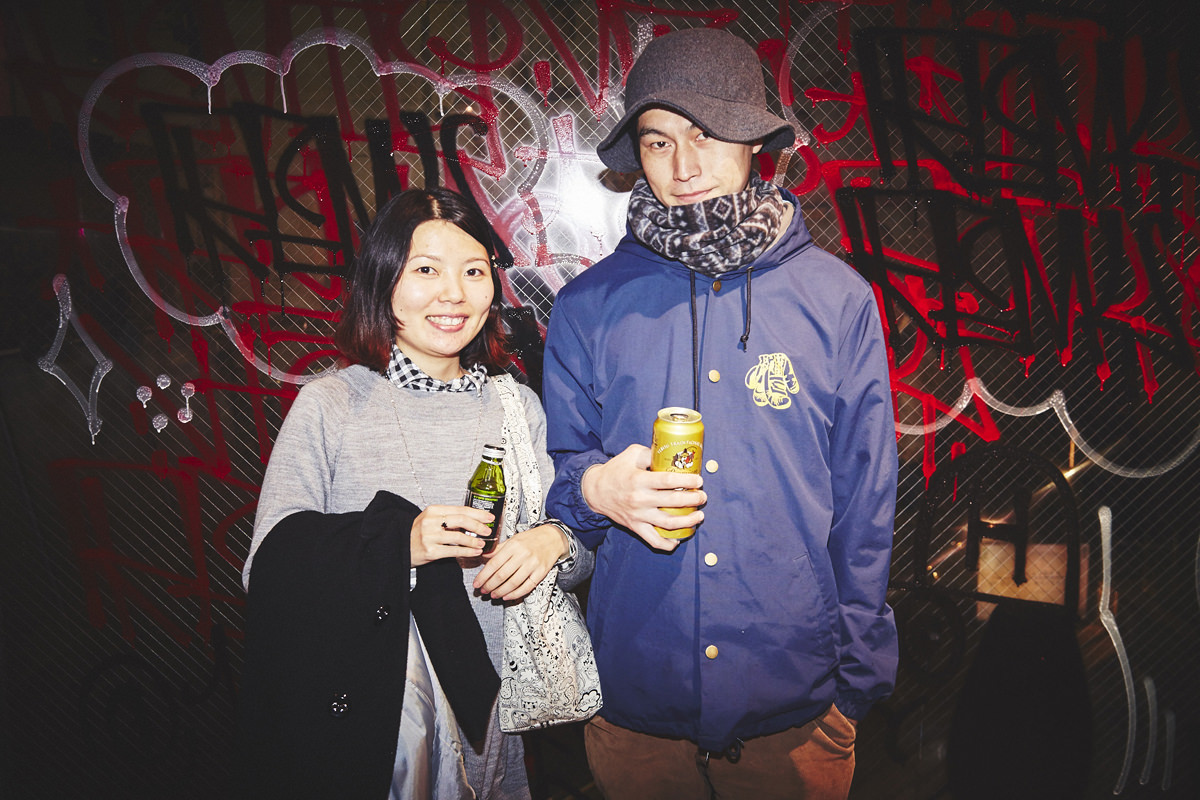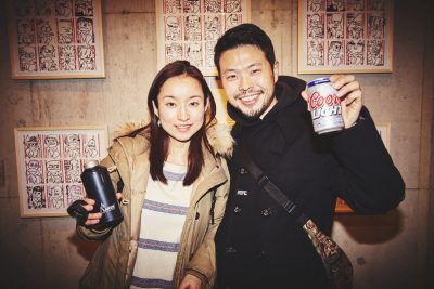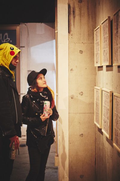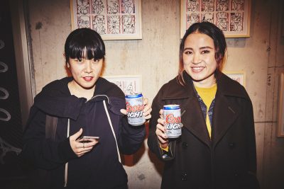会場の窓にはREMIOによるグラフィティ、室内には3Dアート作品やシルクスクリーンポスターが展示され、来場者がドリンクを片手に展示を楽しんでいた。