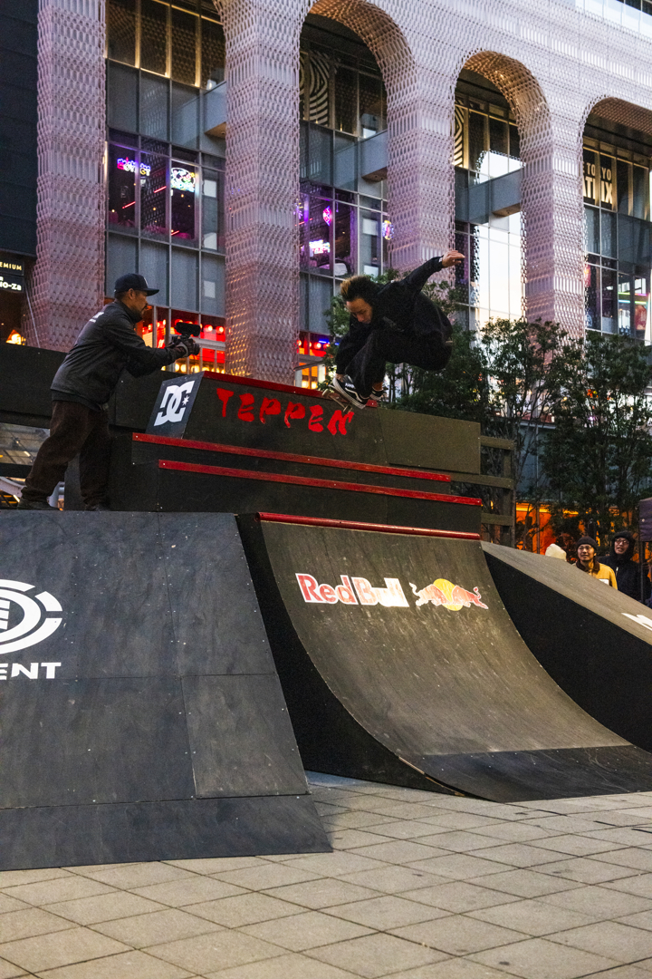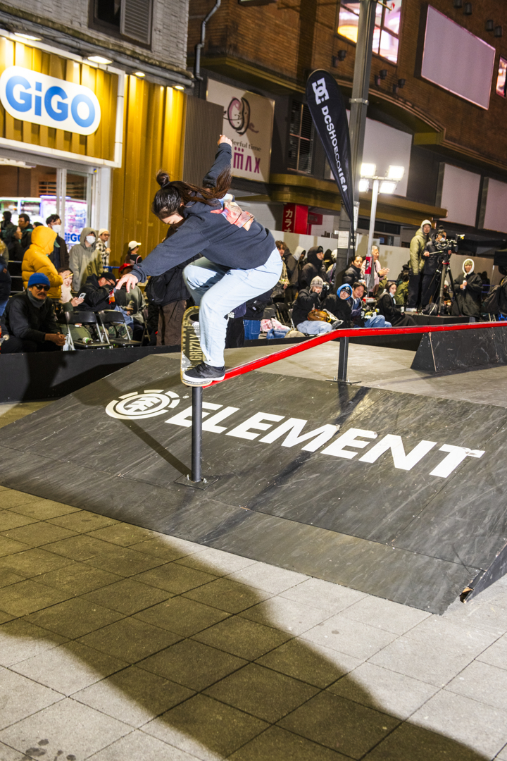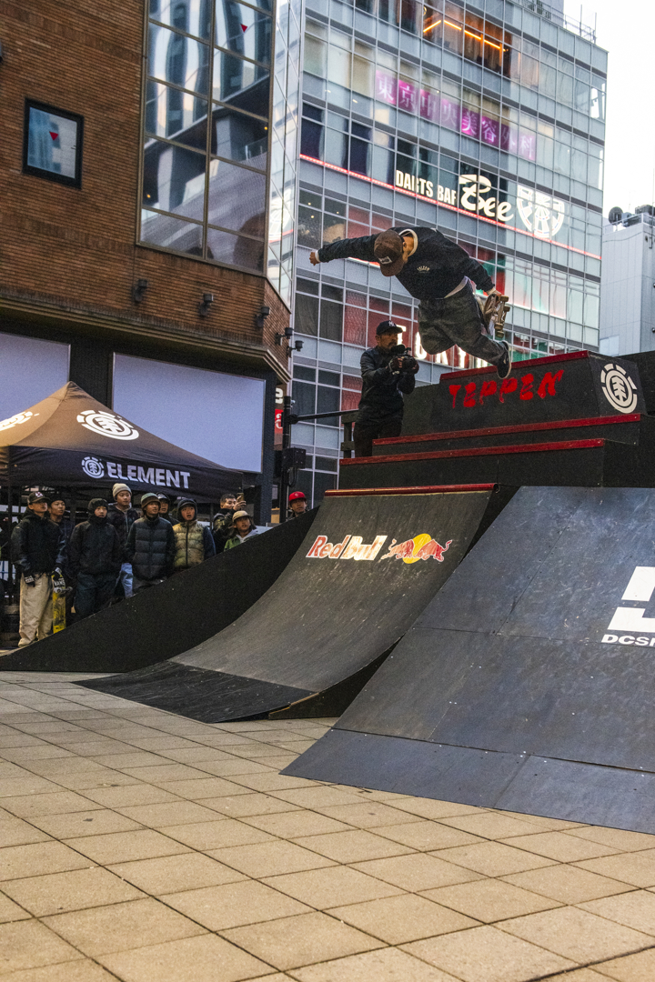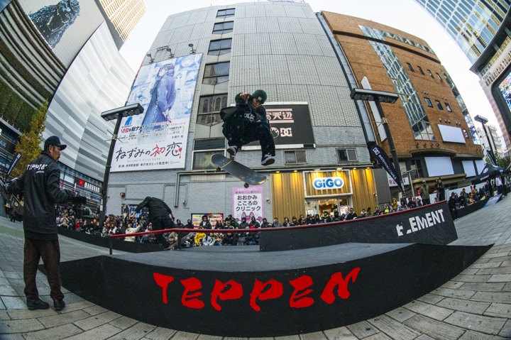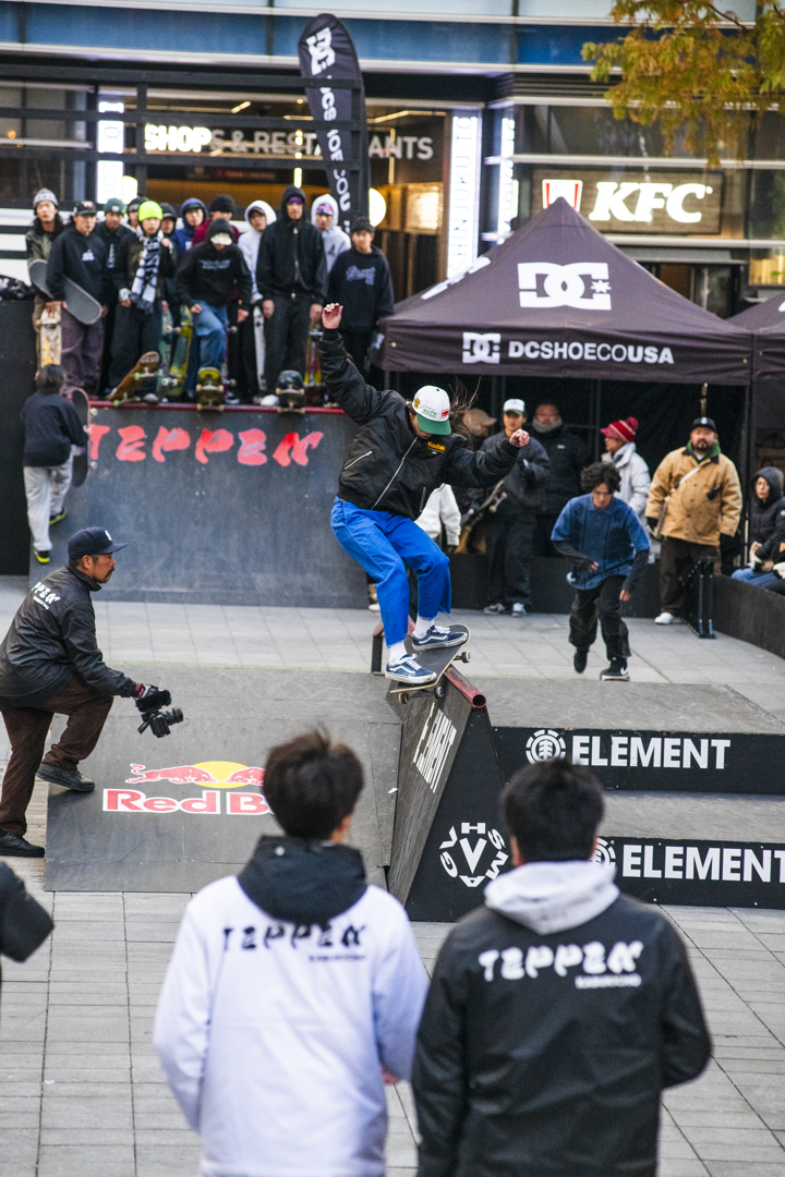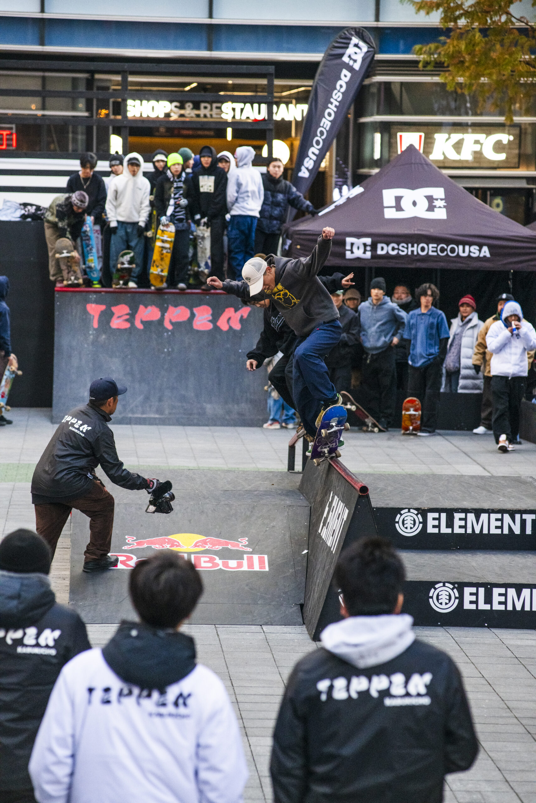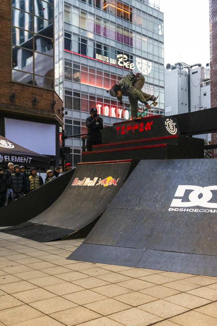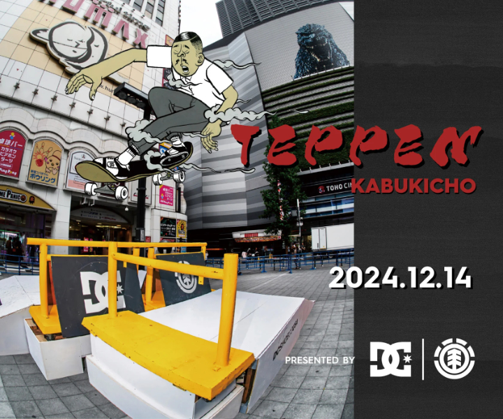 DCとElementによるスケートの祭典TEPPENが12月14日(土)に新宿・歌舞伎町で開催された。会場は行き場を失った通称「トー横キッズ」がかつてたむろしていた歌舞伎町シネシティ広場。大阪とSNS、そして当日の予選を勝ち抜いた一般スケーター、さらに豪華な招待スケーターによって繰り広げられるバトルはStage 01〜03。バンクとレッジを組み合わせたStage01では柿谷季輝がウォーリーでセクションを全越えしてMVPを獲得。続いてステア、バンク、レールから成るStage 02ではバンクtoバンクでのキックフリップバック3を決めた佐々木音憧、さらにレールでSs 50-50のバンクインを決めた瀬尻 稜の2名がMVP。バンクとクオーターパイプでトップのレッジを攻める最終ステージではT4がバックテールストールからのBs180アウトでMVP。会場のテンションもMAXに達したタイミングでコースを手掛けたMBM Parkbuildersの木村会長が登場し、Fsロケットブラントを決めた鎧 碧斗がMBM賞をゲット。本戦後は一般参加のベストトリックが男女でそれぞれ行われ、第3回目のTEPPENが終了。晴天ながらもビルの谷間ということで日差しがなく、冷たいビル風が吹きつける環境ながらも繰り広げられたセッションは激アツ。また来年の開催をお楽しみに!!
