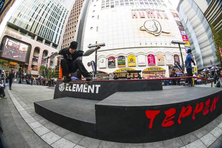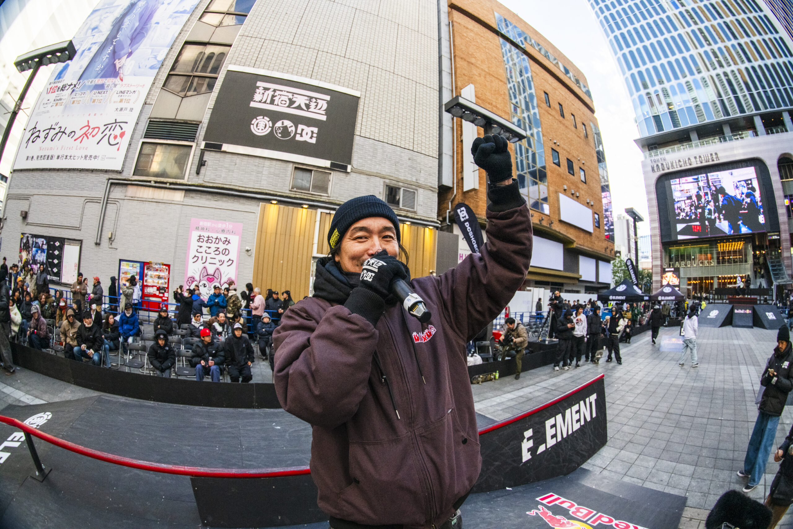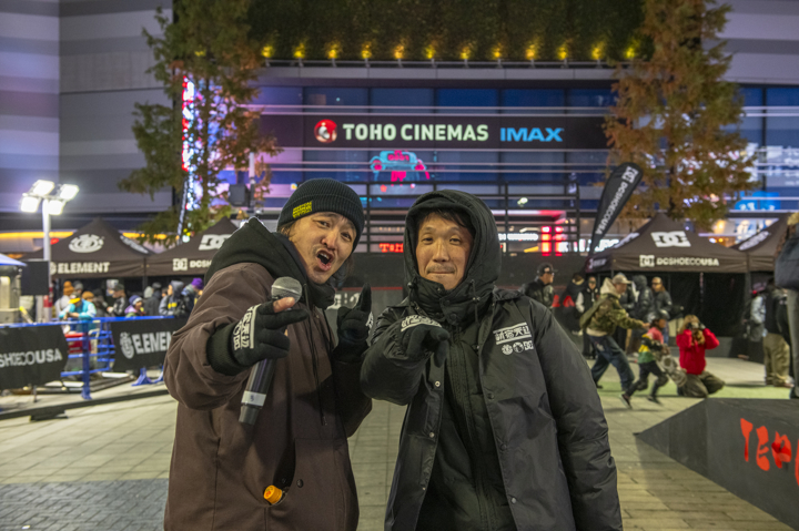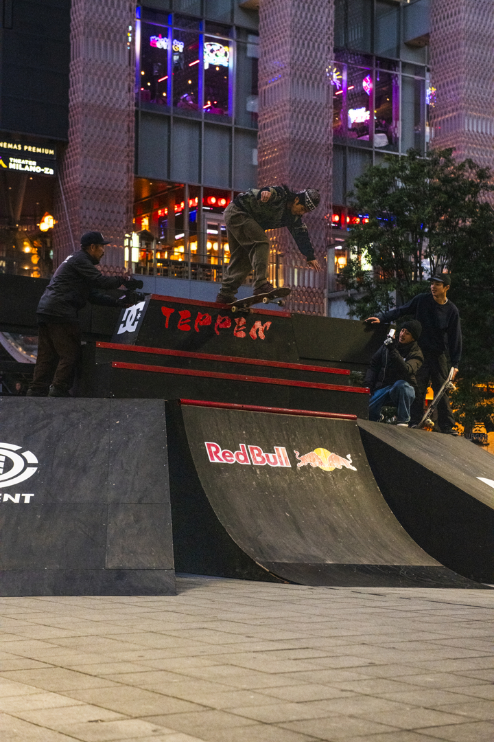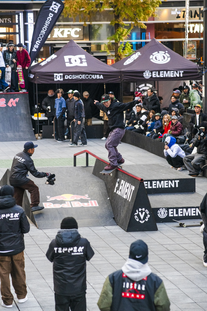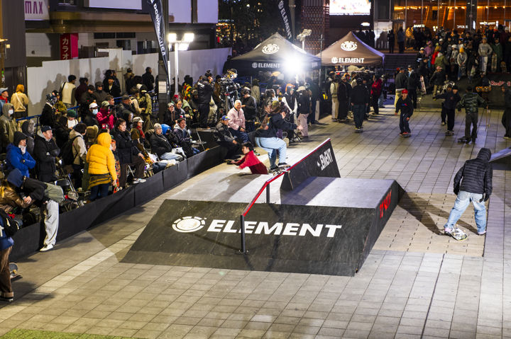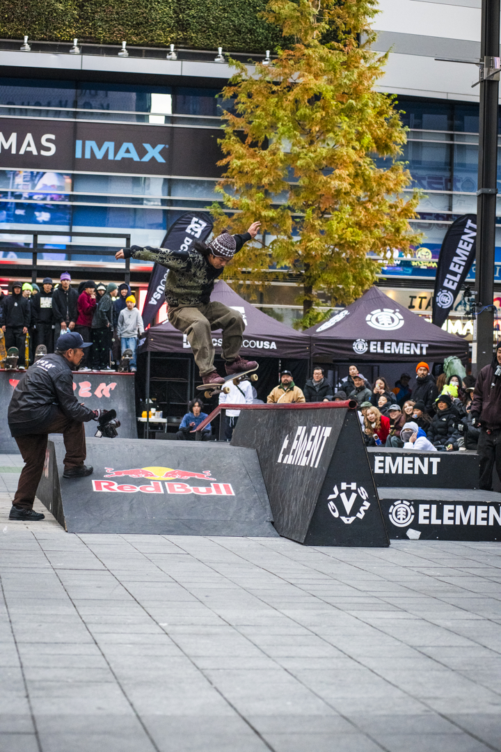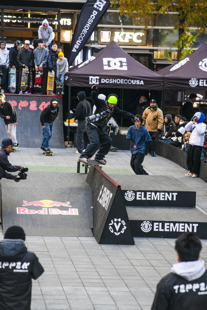 DCとElementによるスケートの祭典TEPPENが12月14日(土)に新宿・歌舞伎町で開催された。会場は行き場を失った通称「トー横キッズ」がかつてたむろしていた歌舞伎町シネシティ広場。大阪とSNS、そして当日の予選を勝ち抜いた一般スケーター、さらに豪華な招待スケーターによって繰り広げられるバトルはStage 01〜03。バンクとレッジを組み合わせたStage01では柿谷季輝がウォーリーでセクションを全越えしてMVPを獲得。続いてステア、バンク、レールから成るStage 02ではバンクtoバンクでのキックフリップバック3を決めた佐々木音憧、さらにレールでSs 50-50のバンクインを決めた瀬尻 稜の2名がMVP。バンクとクオーターパイプでトップのレッジを攻める最終ステージではT4がバックテールストールからのBs180アウトでMVP。会場のテンションもMAXに達したタイミングでコースを手掛けたMBM Parkbuildersの木村会長が登場し、Fsロケットブラントを決めた鎧 碧斗がMBM賞をゲット。本戦後は一般参加のベストトリックが男女でそれぞれ行われ、第3回目のTEPPENが終了。晴天ながらもビルの谷間ということで日差しがなく、冷たいビル風が吹きつける環境ながらも繰り広げられたセッションは激アツ。また来年の開催をお楽しみに!!