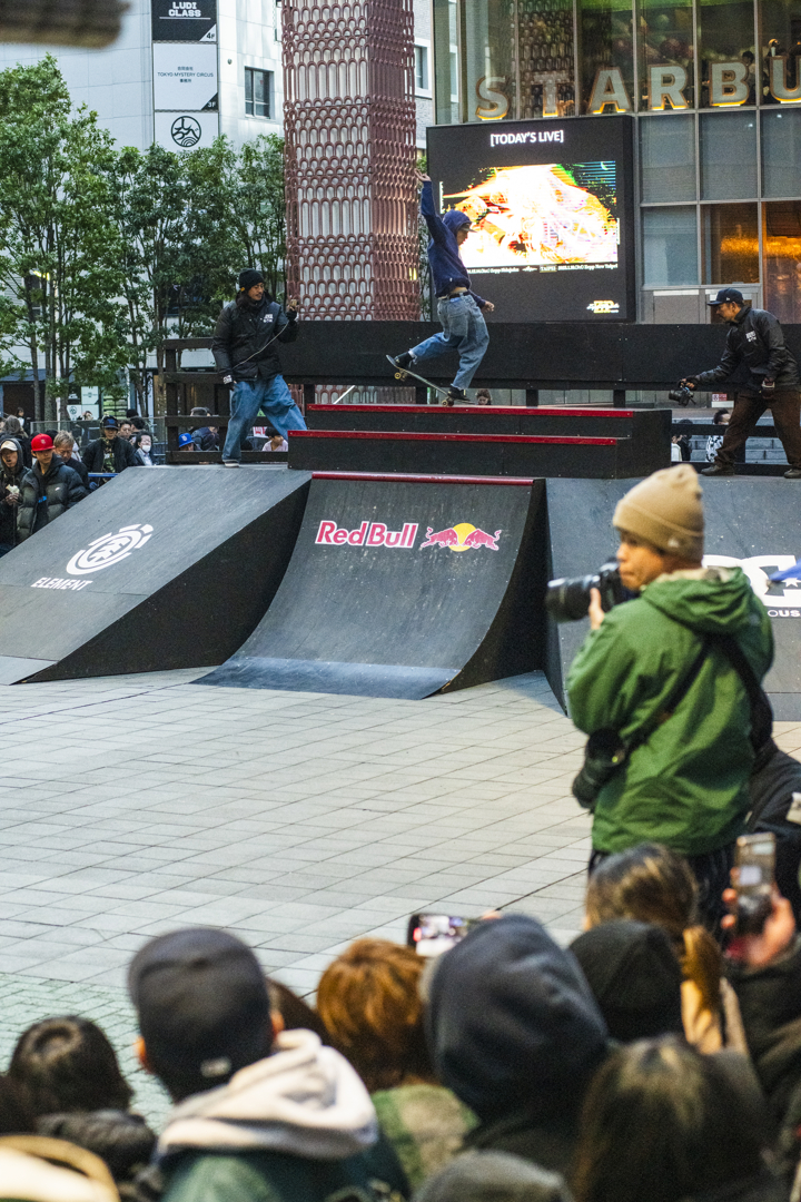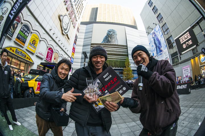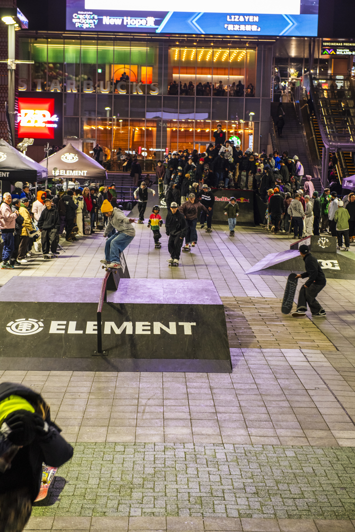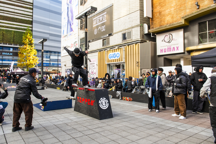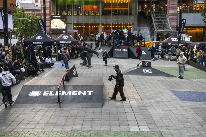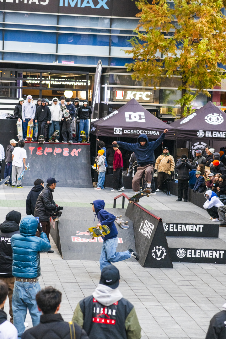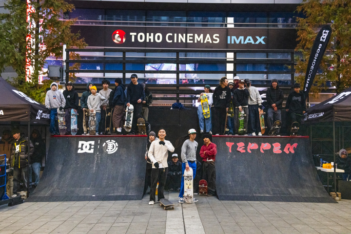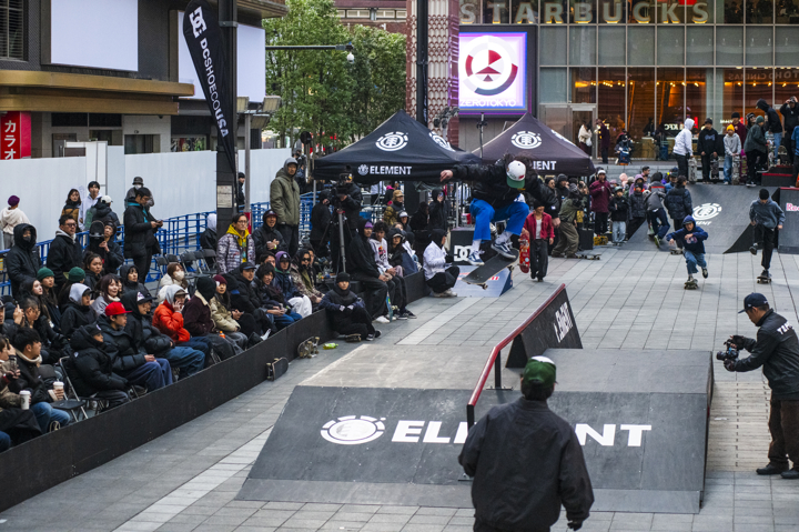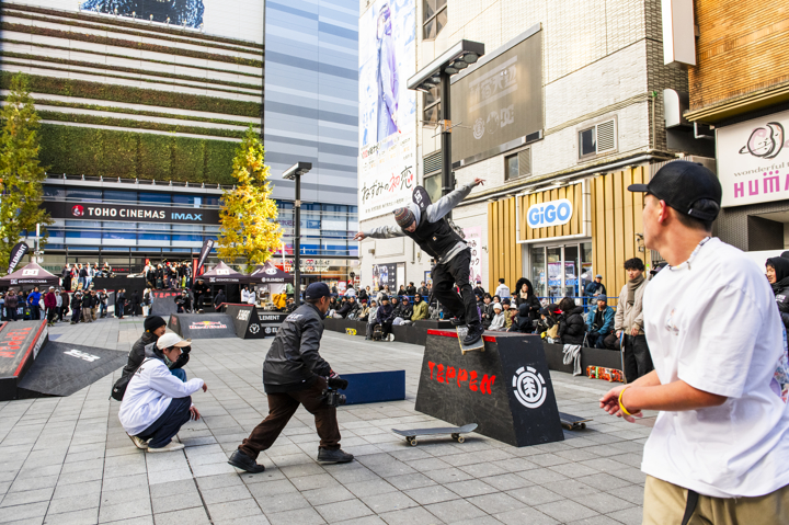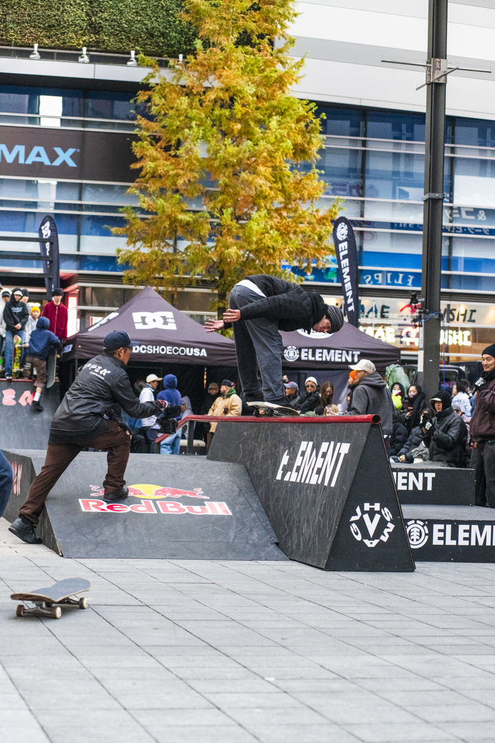 DCとElementによるスケートの祭典TEPPENが12月14日(土)に新宿・歌舞伎町で開催された。会場は行き場を失った通称「トー横キッズ」がかつてたむろしていた歌舞伎町シネシティ広場。大阪とSNS、そして当日の予選を勝ち抜いた一般スケーター、さらに豪華な招待スケーターによって繰り広げられるバトルはStage 01〜03。バンクとレッジを組み合わせたStage01では柿谷季輝がウォーリーでセクションを全越えしてMVPを獲得。続いてステア、バンク、レールから成るStage 02ではバンクtoバンクでのキックフリップバック3を決めた佐々木音憧、さらにレールでSs 50-50のバンクインを決めた瀬尻 稜の2名がMVP。バンクとクオーターパイプでトップのレッジを攻める最終ステージではT4がバックテールストールからのBs180アウトでMVP。会場のテンションもMAXに達したタイミングでコースを手掛けたMBM Parkbuildersの木村会長が登場し、Fsロケットブラントを決めた鎧 碧斗がMBM賞をゲット。本戦後は一般参加のベストトリックが男女でそれぞれ行われ、第3回目のTEPPENが終了。晴天ながらもビルの谷間ということで日差しがなく、冷たいビル風が吹きつける環境ながらも繰り広げられたセッションは激アツ。また来年の開催をお楽しみに!!