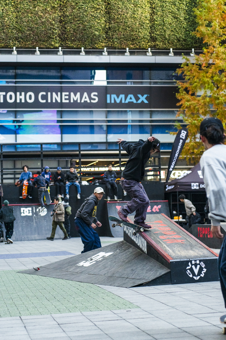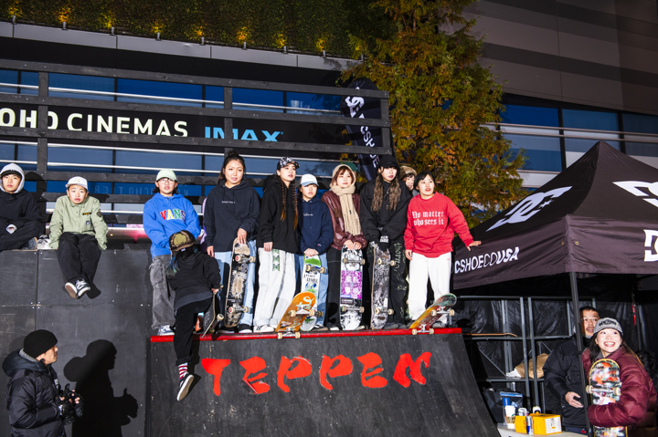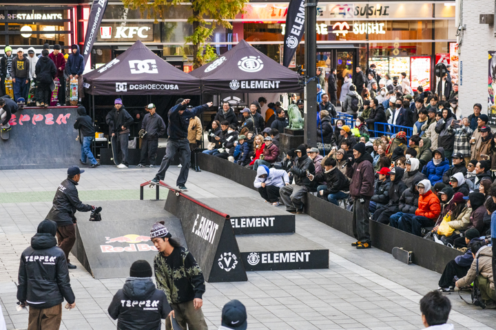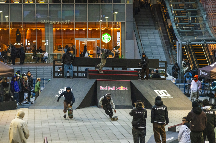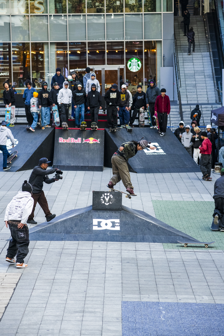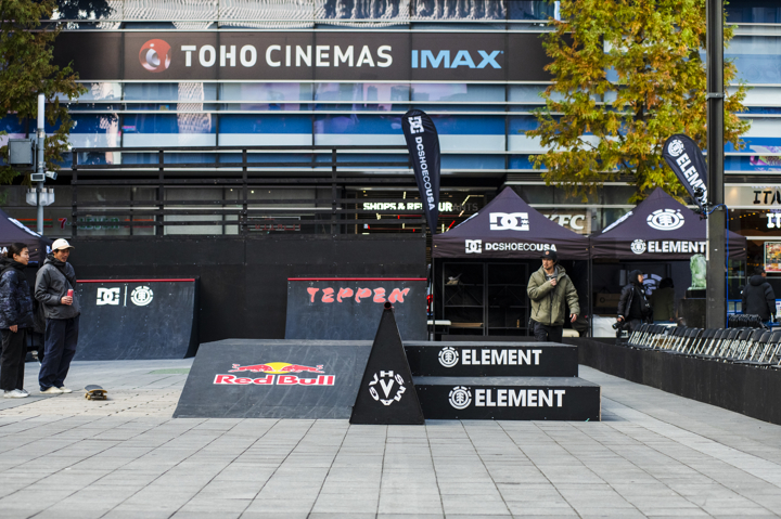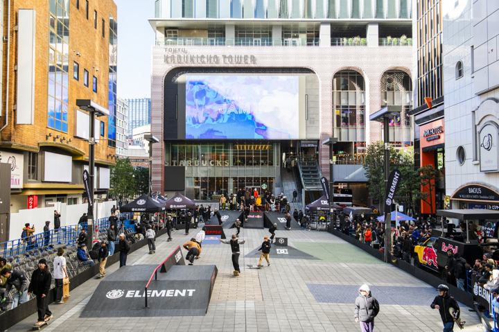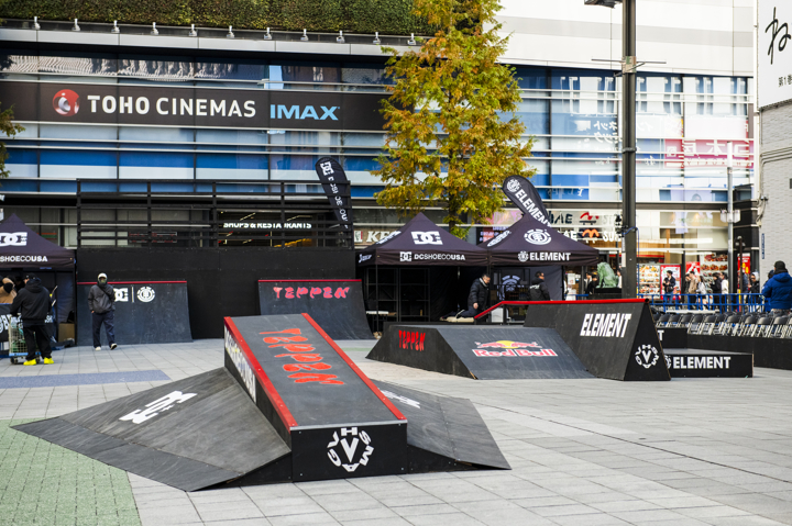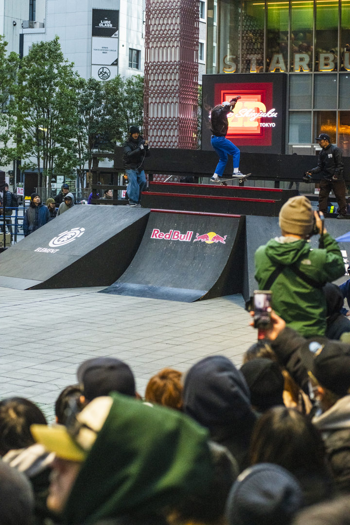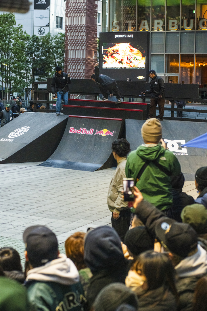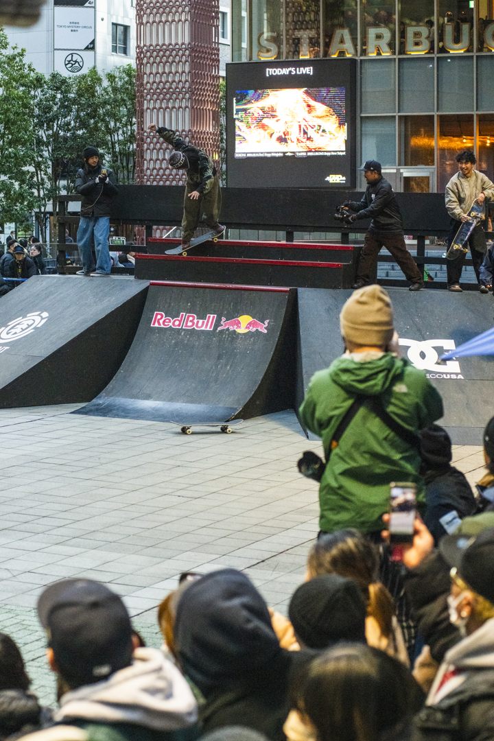DCとElementによるスケートの祭典TEPPENが12月14日(土)に新宿・歌舞伎町で開催された。会場は行き場を失った通称「トー横キッズ」がかつてたむろしていた歌舞伎町シネシティ広場。大阪とSNS、そして当日の予選を勝ち抜いた一般スケーター、さらに豪華な招待スケーターによって繰り広げられるバトルはStage 01〜03。バンクとレッジを組み合わせたStage01では柿谷季輝がウォーリーでセクションを全越えしてMVPを獲得。続いてステア、バンク、レールから成るStage 02ではバンクtoバンクでのキックフリップバック3を決めた佐々木音憧、さらにレールでSs 50-50のバンクインを決めた瀬尻 稜の2名がMVP。バンクとクオーターパイプでトップのレッジを攻める最終ステージではT4がバックテールストールからのBs180アウトでMVP。会場のテンションもMAXに達したタイミングでコースを手掛けたMBM Parkbuildersの木村会長が登場し、Fsロケットブラントを決めた鎧 碧斗がMBM賞をゲット。本戦後は一般参加のベストトリックが男女でそれぞれ行われ、第3回目のTEPPENが終了。晴天ながらもビルの谷間ということで日差しがなく、冷たいビル風が吹きつける環境ながらも繰り広げられたセッションは激アツ。また来年の開催をお楽しみに!!