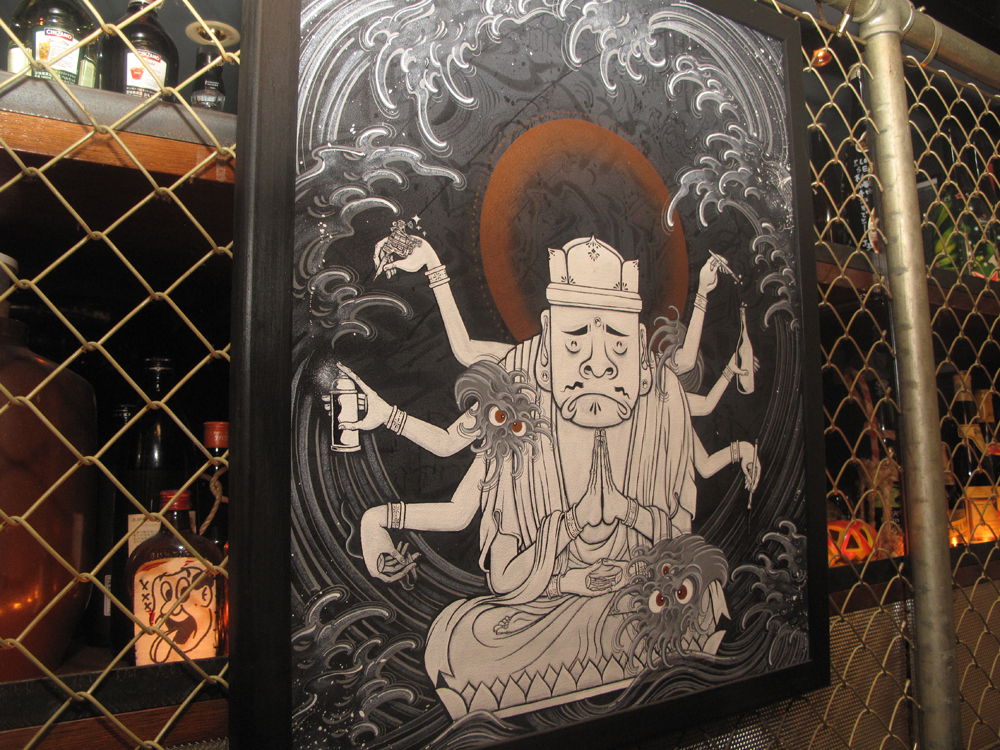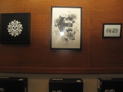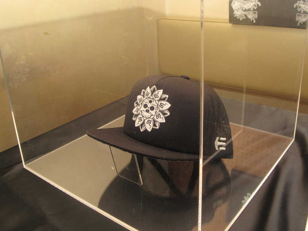 会場では、野坂氏によるライブペインティングはもちろんのこと、今回のコラボレーションアイテムやアートワークが所狭しと展示。