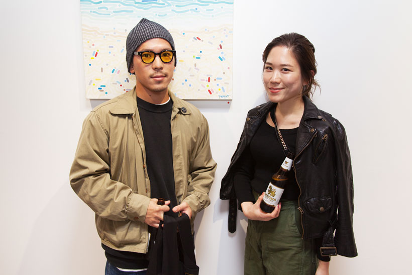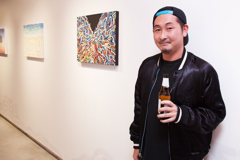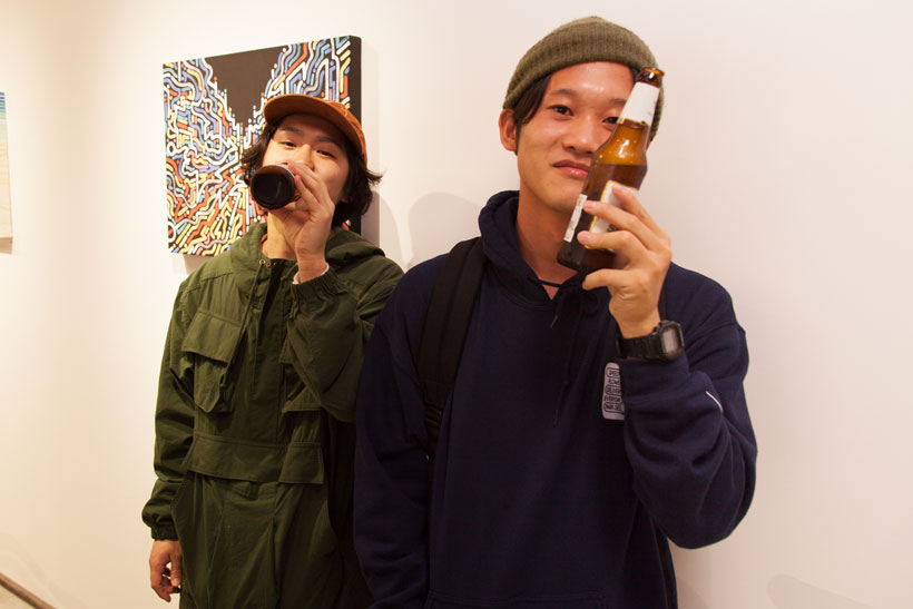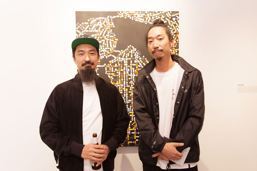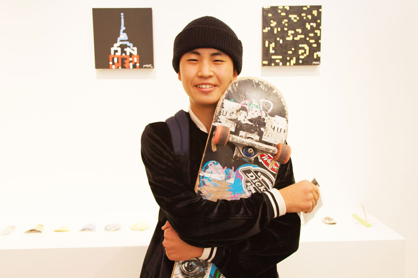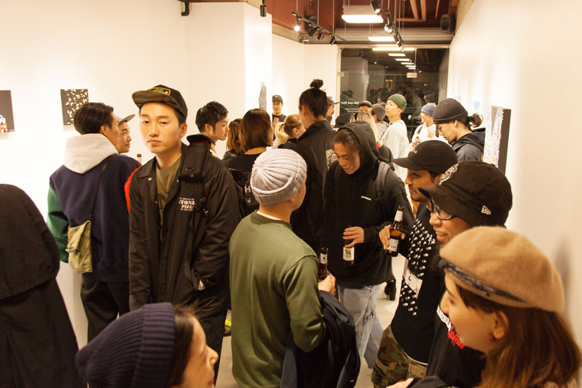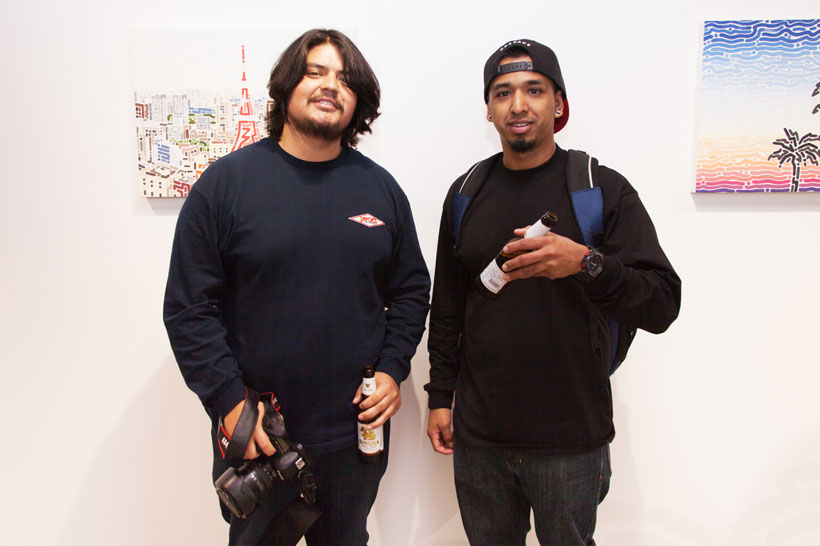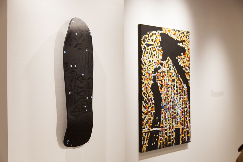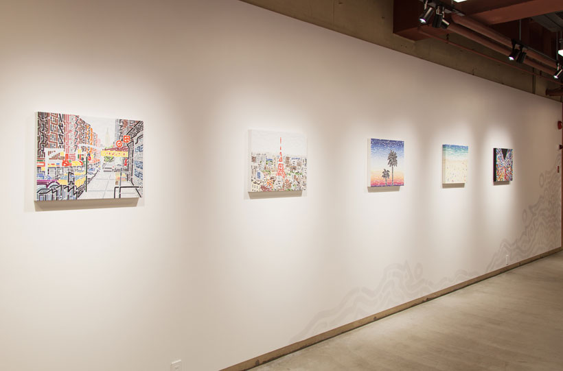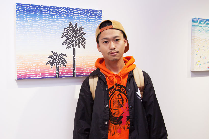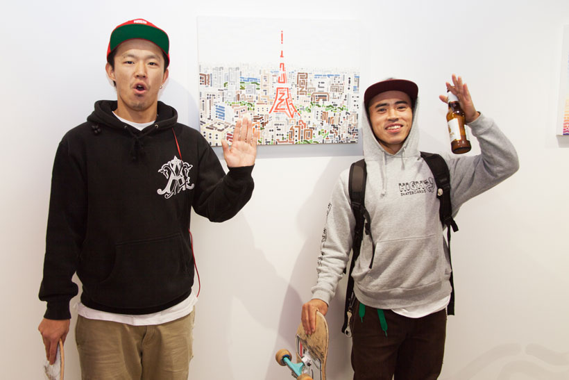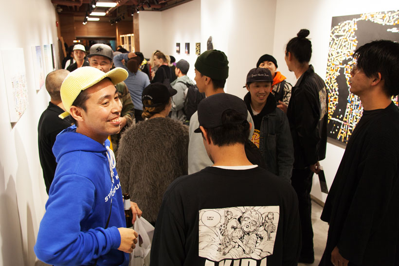 カラフルな点や線を用いてフリーハンドで描かれる風景を中心とした作品の数々を展示。スケートをバックボーンに持つアーティストだけに多くのスケーターが来場し盛り上がりを見せていた。