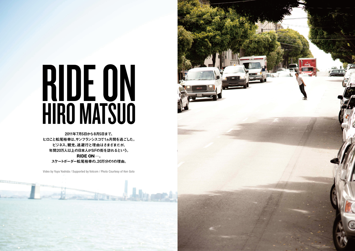 2011年7月5日から、8月5日まで。 ヒロこと松尾裕幸は、サンフランシスコで1ヵ月間を過ごした。ビジネス、観光、逃避行と理由はさまざまだが、年間20万人以上の日本人がSFの街を訪れるという。RIDE ON -。スケートボーダー松尾裕幸の、20万分の1の理由。